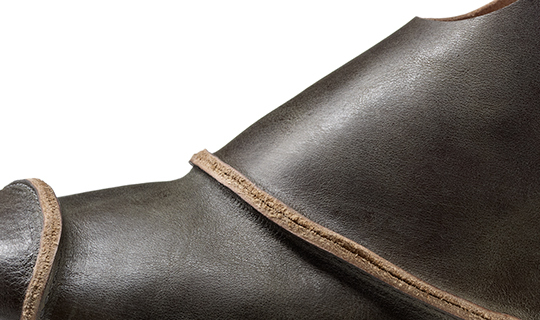 Pflanzlich gegerbtes und gewalktes Kalbsleder in zwei Varianten: glatt und mit schuppenartiger Reptilienstruktur. Wird mit Gebrauch weicher und kann sich dehnen.