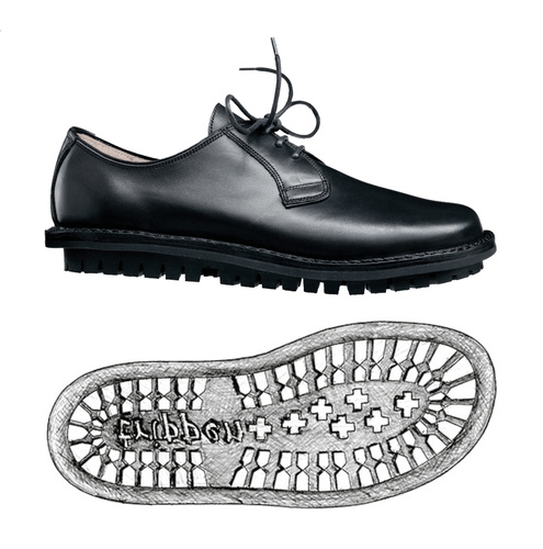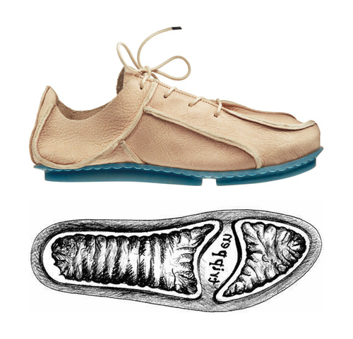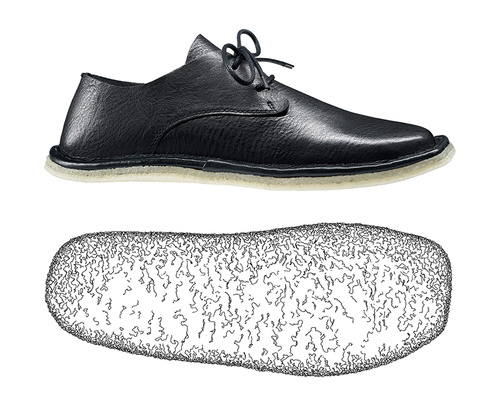 Grâce à une technique de coupe sophistiquée, les tiges conservent leur forme sans renforts, permettant ainsi des modèles sans plastique. Le cuir souple est cousu directement sur des semelles flexibles, éliminant presque totalement les colles à base de solvants. La semelle, semblable à un trampoline, absorbe naturellement les chocs, tandis que la couche de feutre sous la semelle intérieure permet au pied de former sa propre empreinte. Ancrée dans l'artisanat traditionnel, chaque paire présente de légères variations, qui la rendent unique.