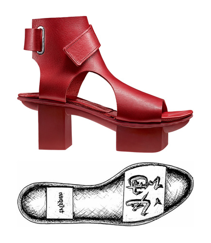 Avec sa plateforme sculpturale de 11 cm, la collection Geisha pousse plus loin la fusion talon/fonction/confort initiée par la collection Happy. La large plateforme garantit stabilité et sécurité. La semelle cubiste est cousue uniquement à l'avant et à l'arrière, créant un vide distinctif au centre.