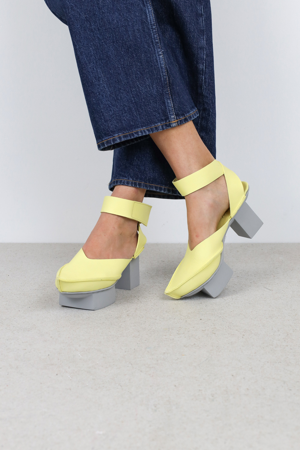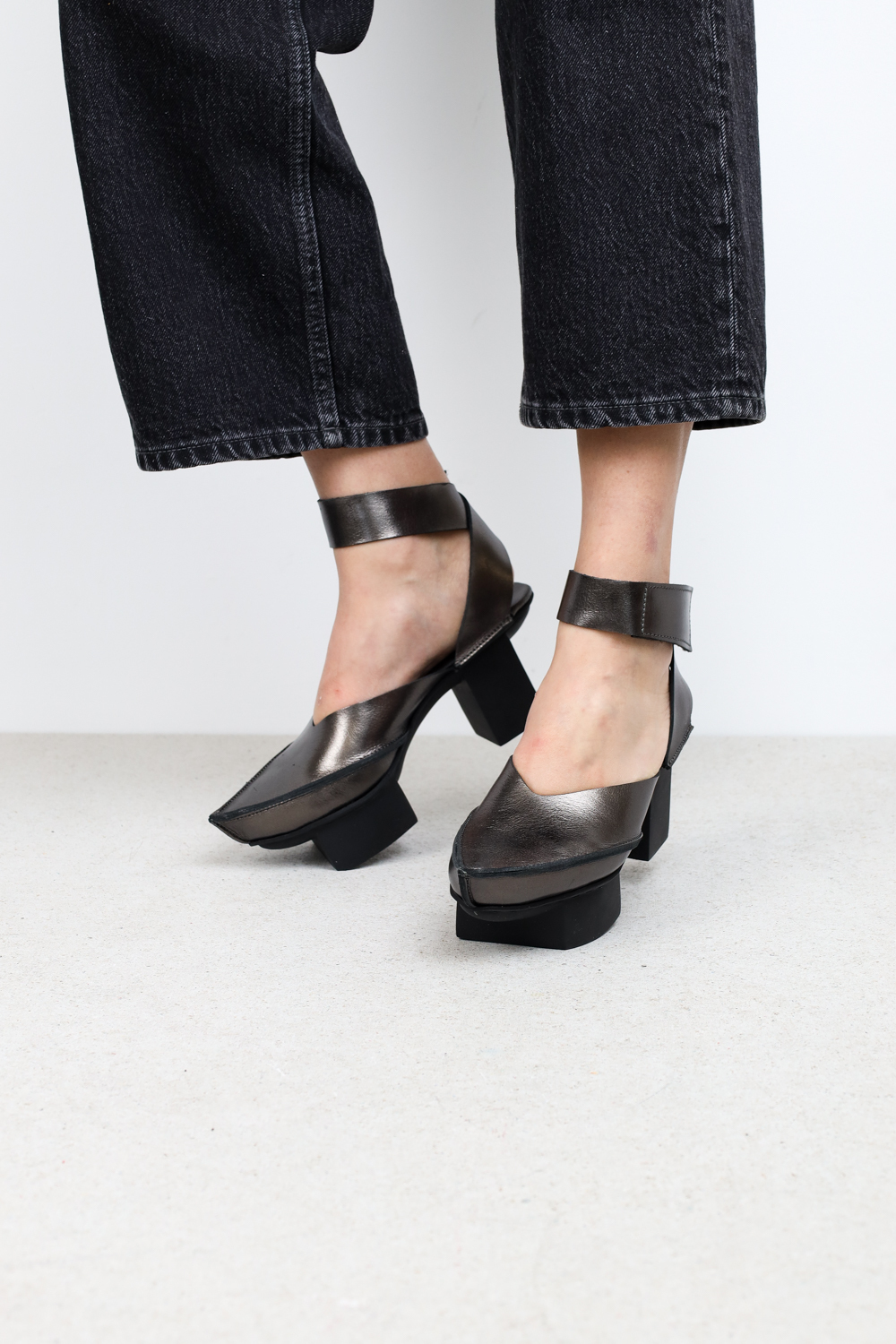 Une tige de style gothique maintient l’avant-pied, tandis que les brides de cheville se croisent derrière le talon et se ferment par une bande auto-agrippante.