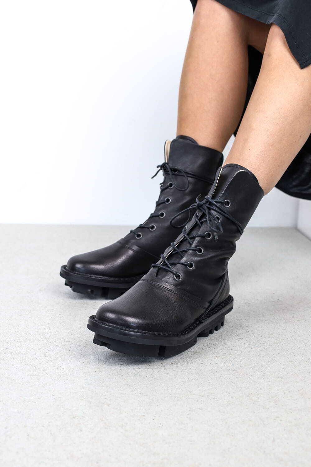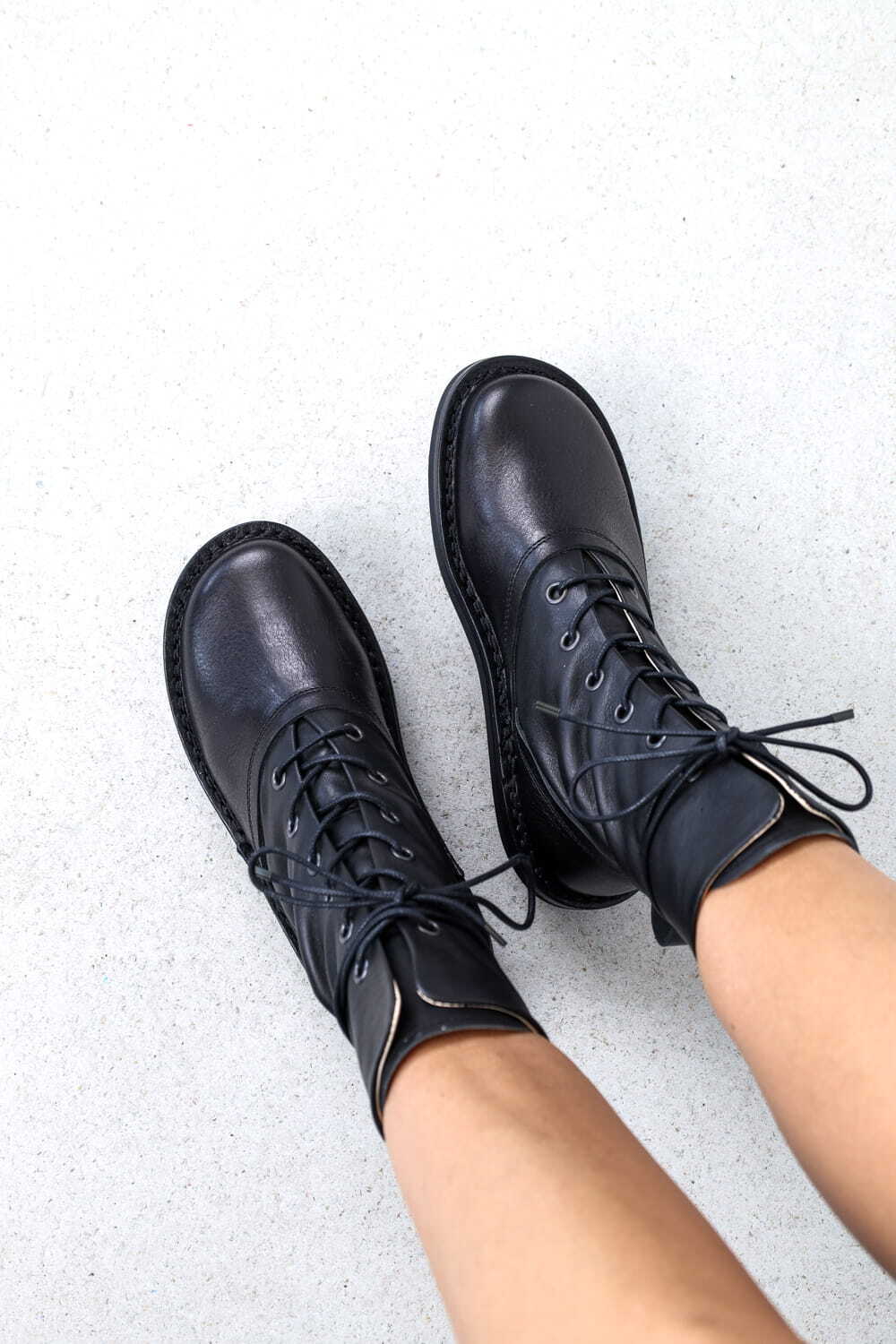 Average est une botte robuste doublée de cuir avec des œillets pour le laçage. La patte rapportée et le talon sont mis en valeur par une couture décorative. Des lacets extra-longs peuvent être passés nonchalamment dans la languette arrière et lacés autour de la cheville
