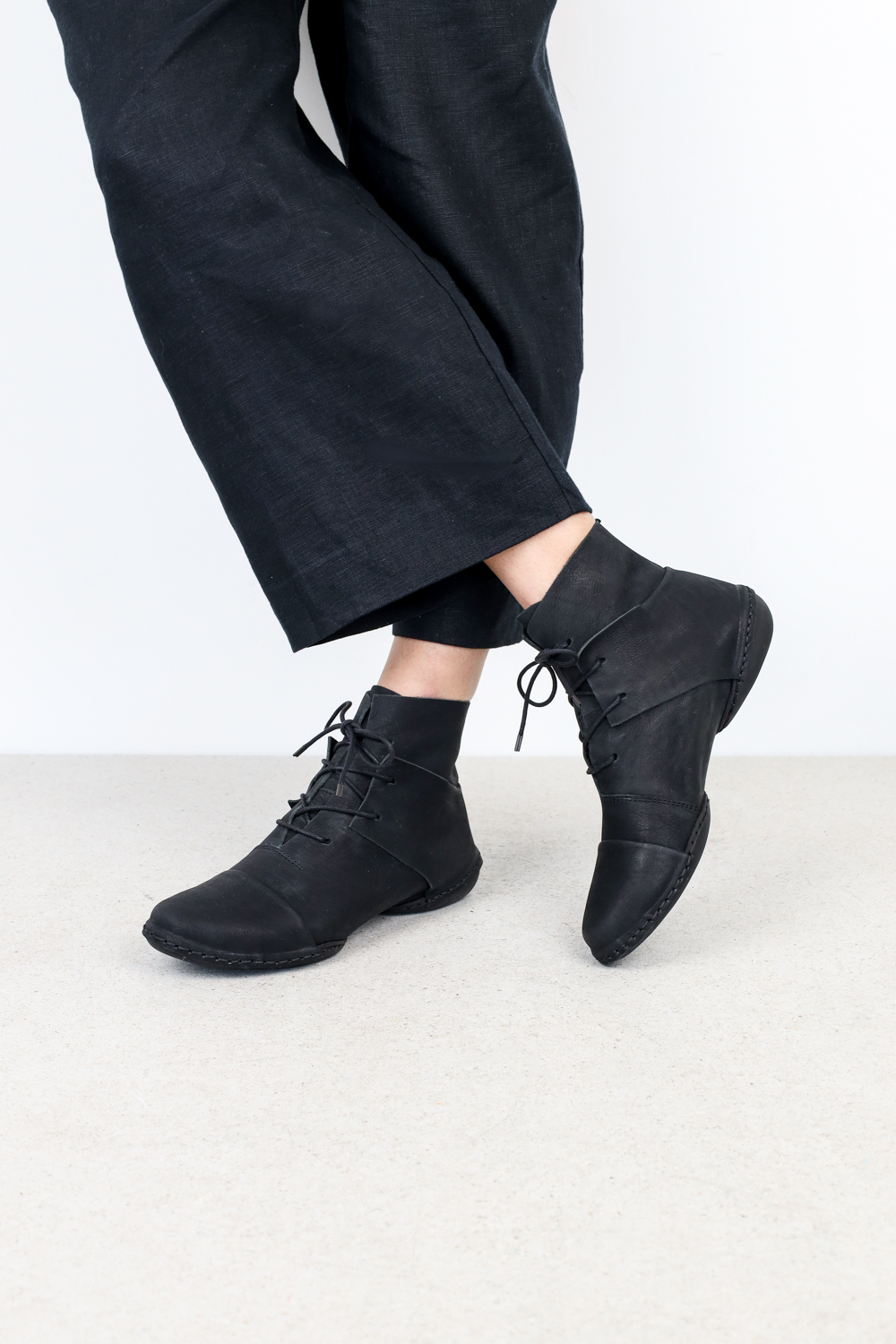 Bottine à lacets unisexe d'avant-garde dont le bout et le talon rapporté ne sont pas pincés, mais cousus dans la couture de la semelle.