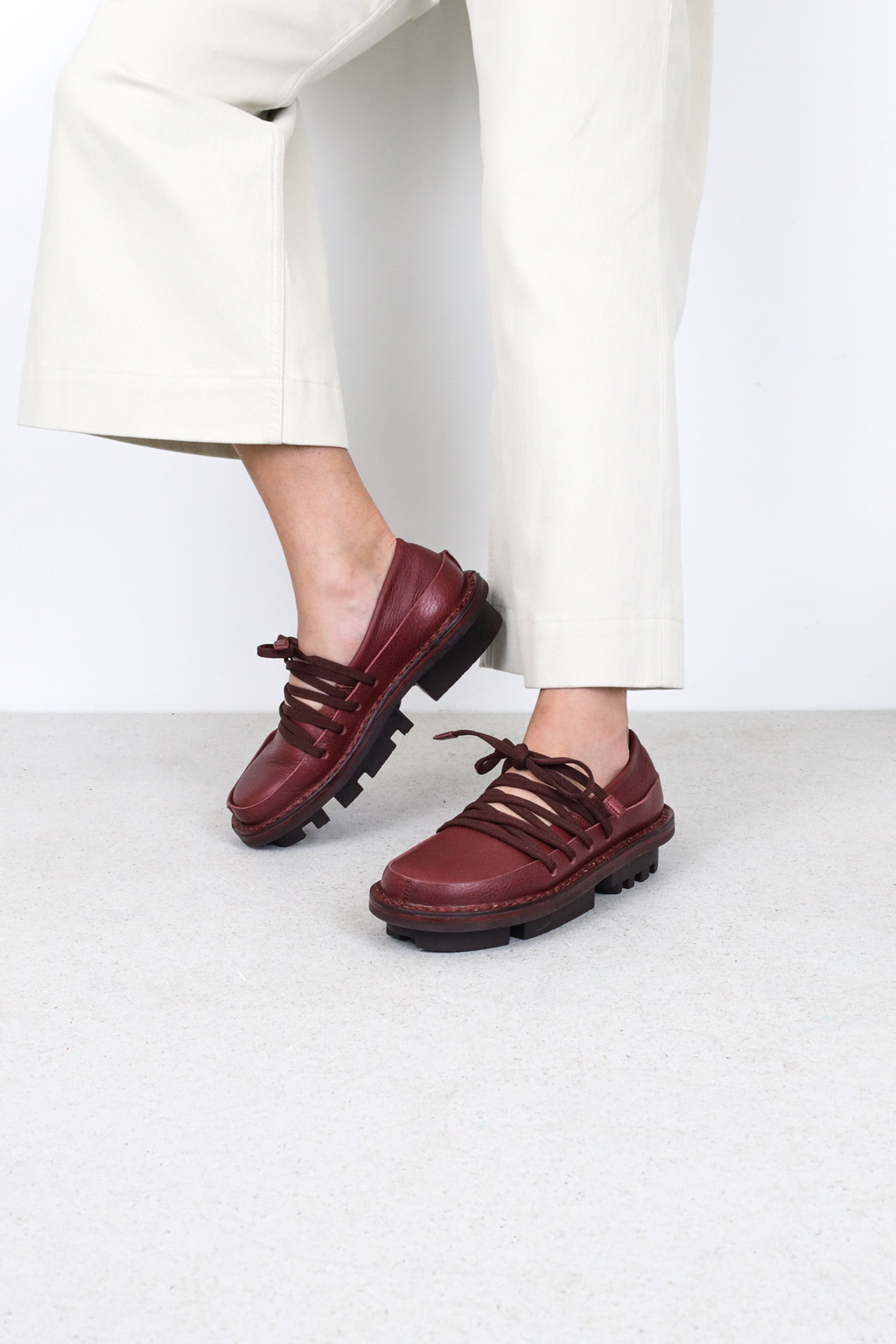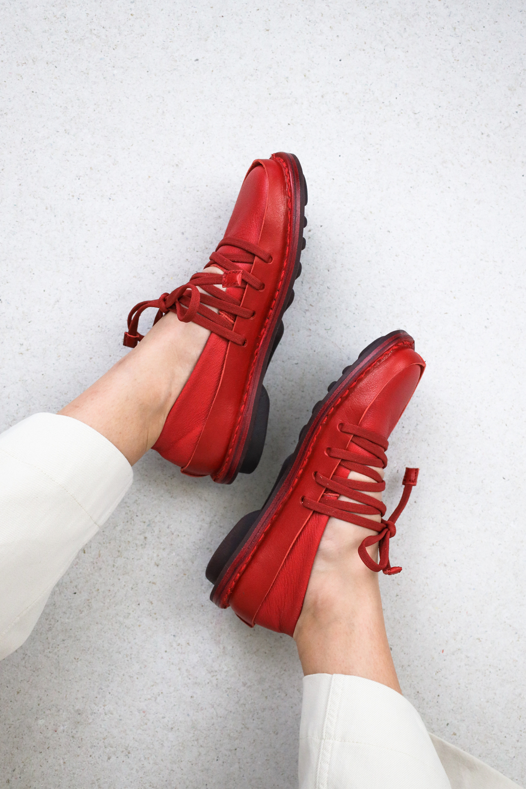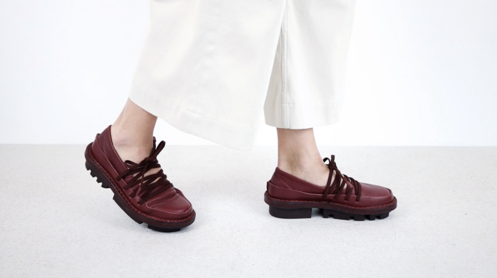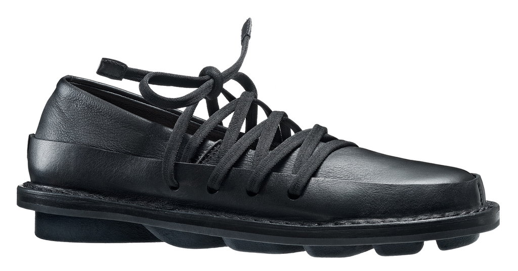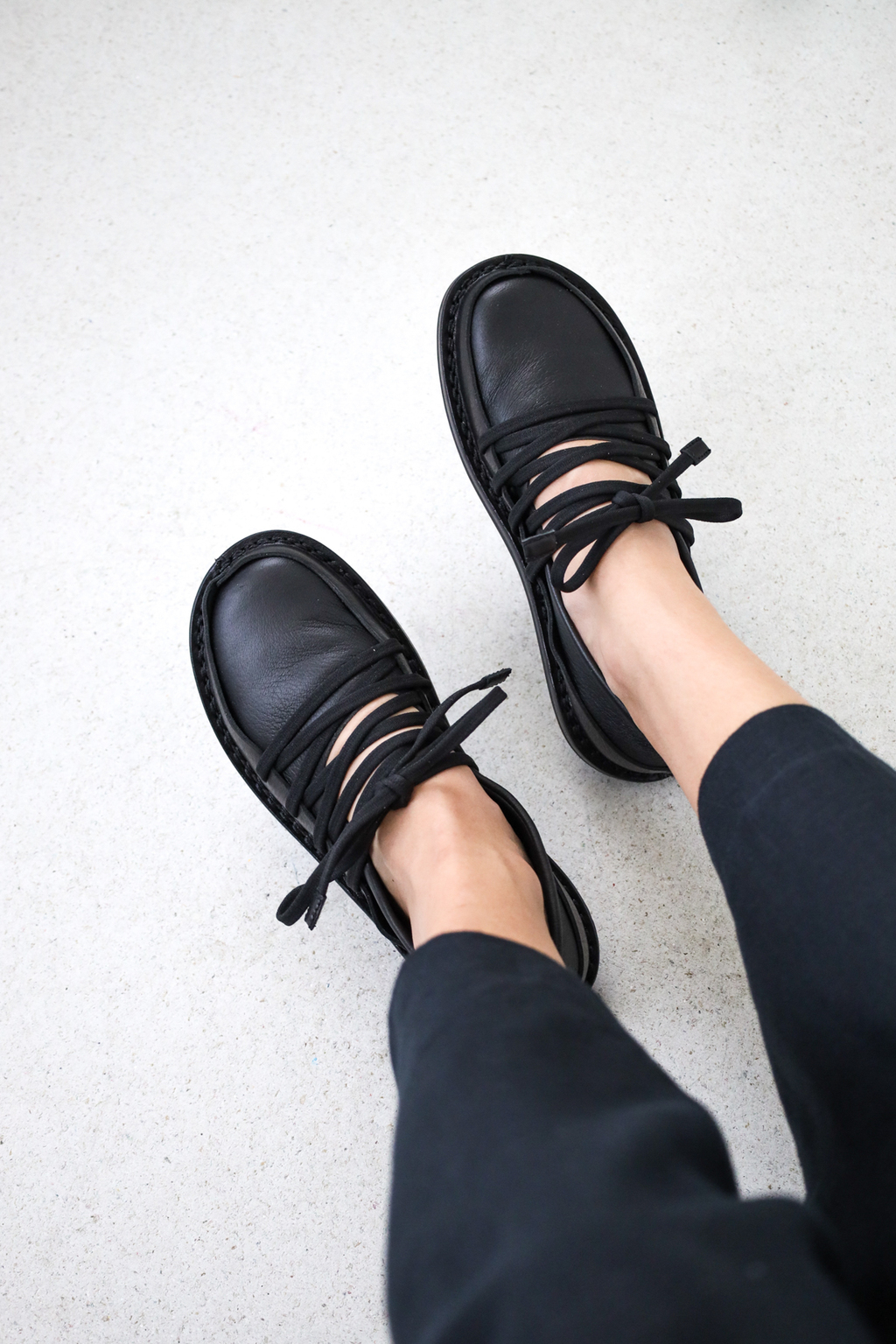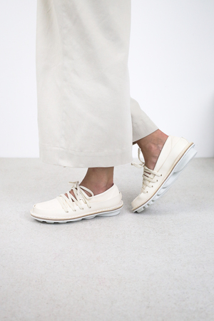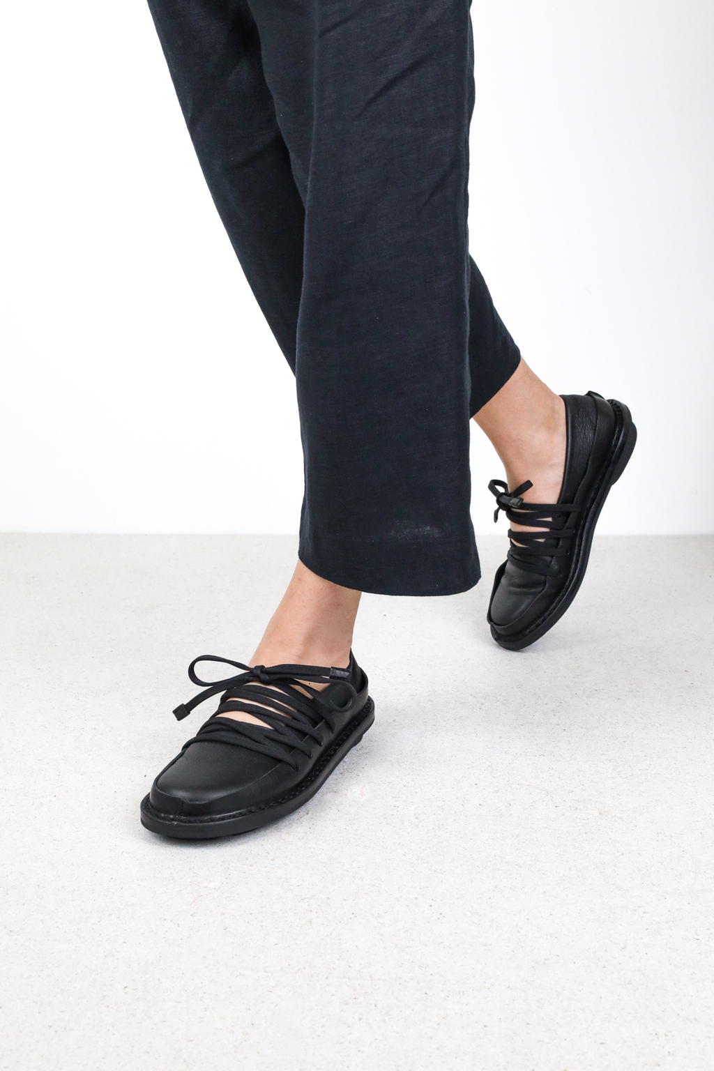 Ballerine en cuir souple avec un bord en cuir ferme tout autour. Le laçage élastiqué crée une unité géométrique qui maintient le pied de manière souple et flexible.