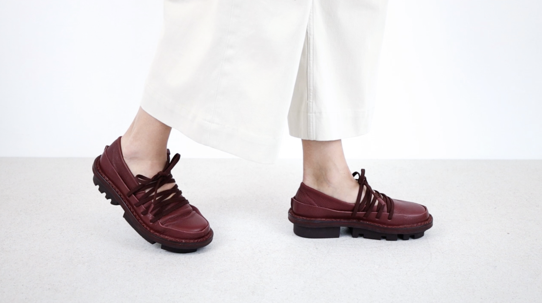 Ballerina aus weichem Leder mit einem umlaufendem festen Lederrand. Durch die Gummizugschnürung entsteht eine geometrische Einheit, die den Fuß flexibel festhält.