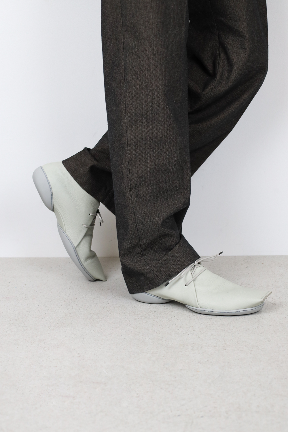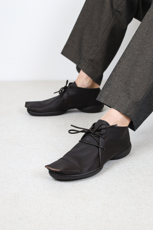 Des formes droites et géométriques ainsi qu’un bout carré semblant tronqué contrastent avec le cuir souple de cette chaussure à lacets.