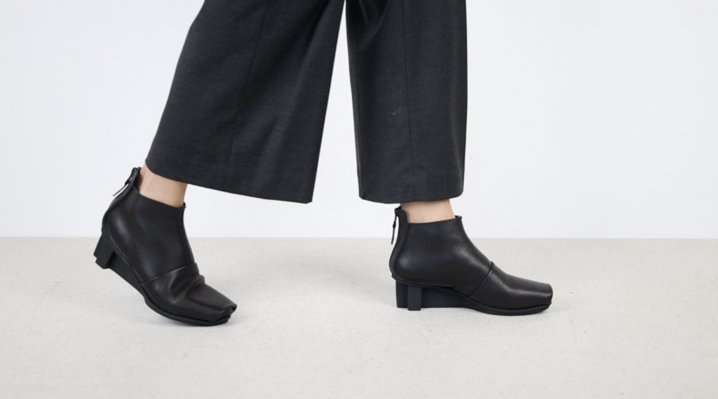 Bottines avec une pointe développée à partir d'un pli qui se ferme confortablement avec une fermeture à glissière bordée
