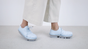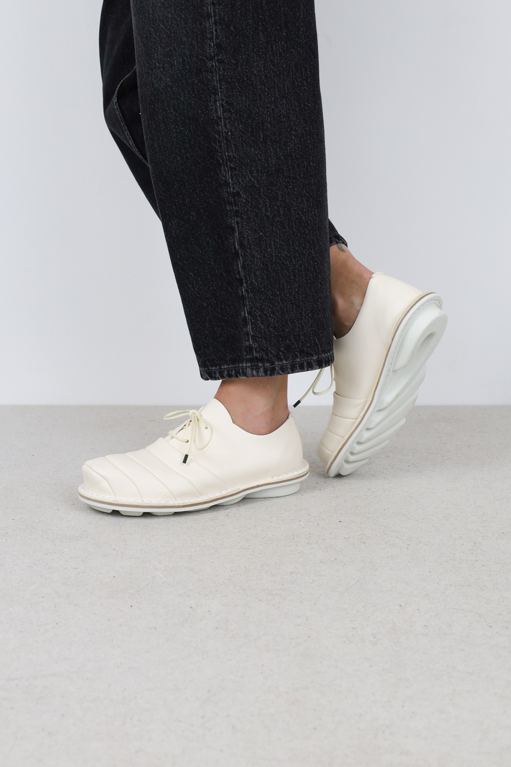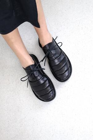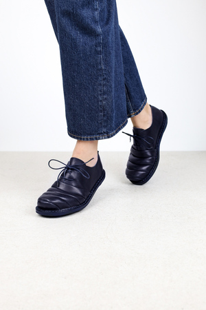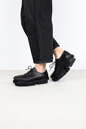 L’exagération fluide et finement travaillée de la partie avant confère à cette chaussure à lacets unisexe une silhouette particulière.