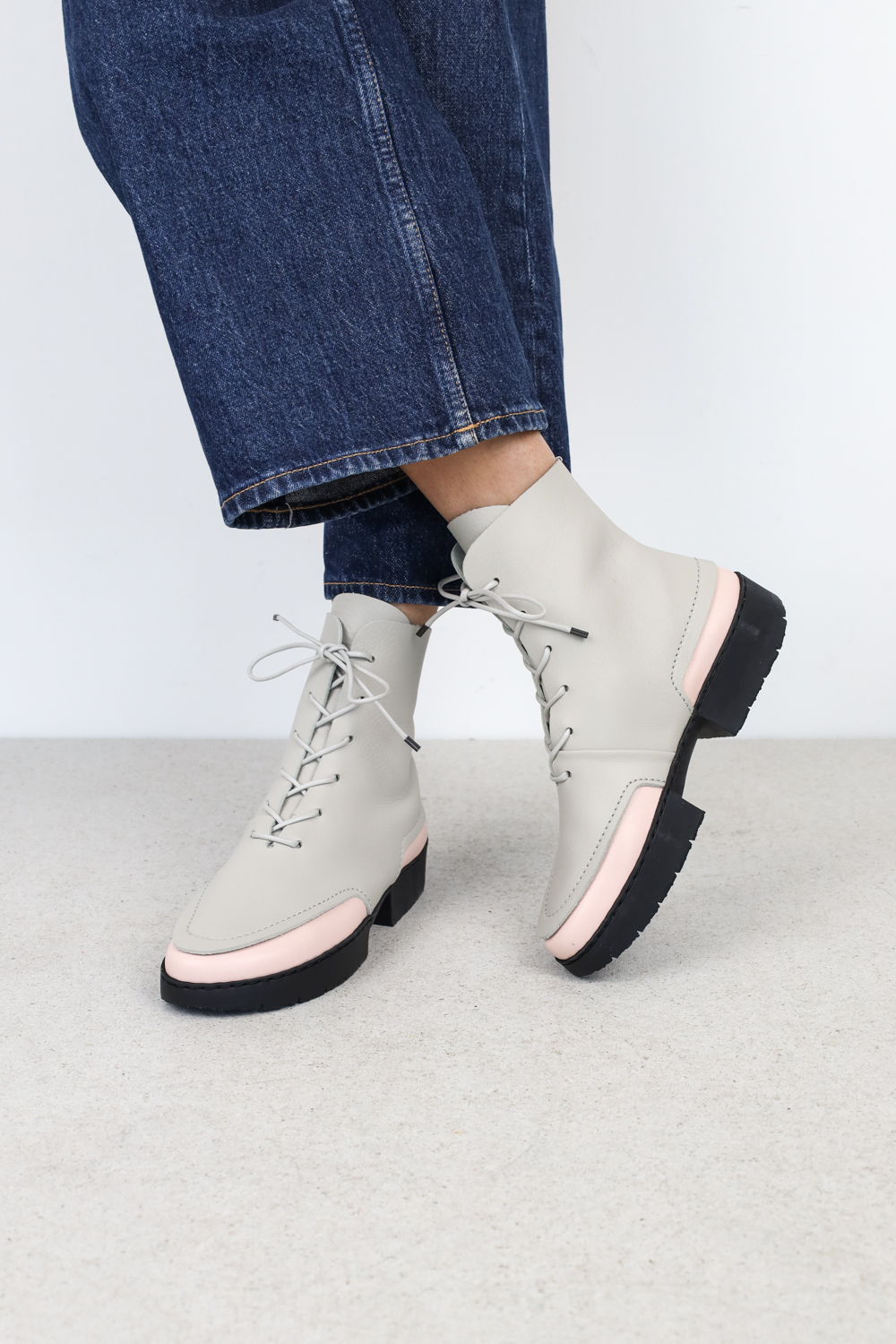 Botte unisexe à lacets avec un design entrelacé et des surpiqûres, encadrant le jeu de la couche extérieure.