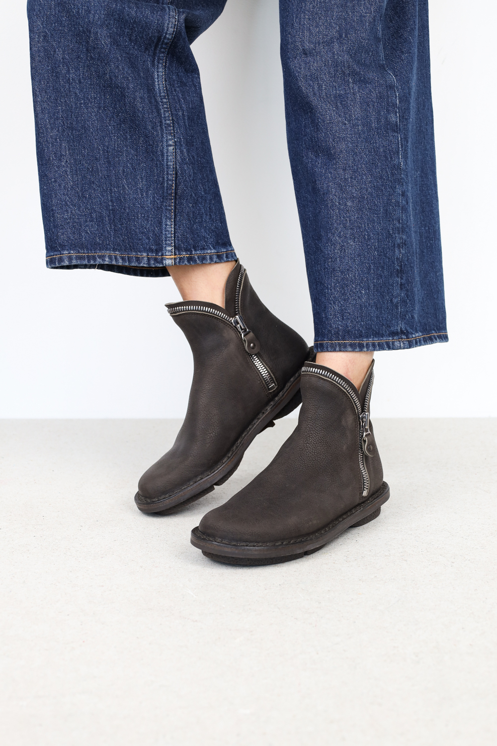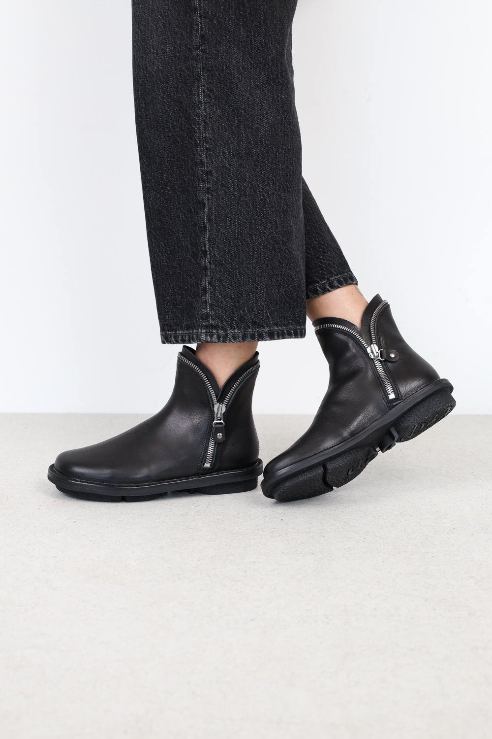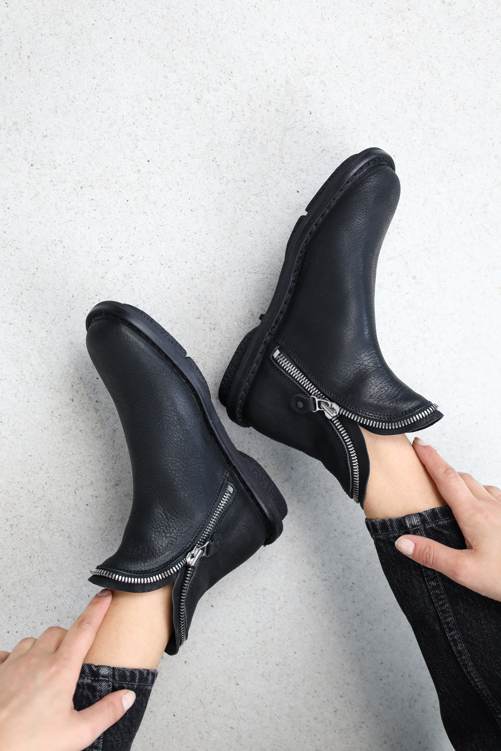 Les deux parties de la tige sans couture sont reliées entre elles uniquement par deux fermetures à glissière à l'intérieur et à l'extérieur. Au-dessus de la cheville, les fermetures éclair se séparent de manière à former un élément décoratif autour de l'extrémité de la tige.