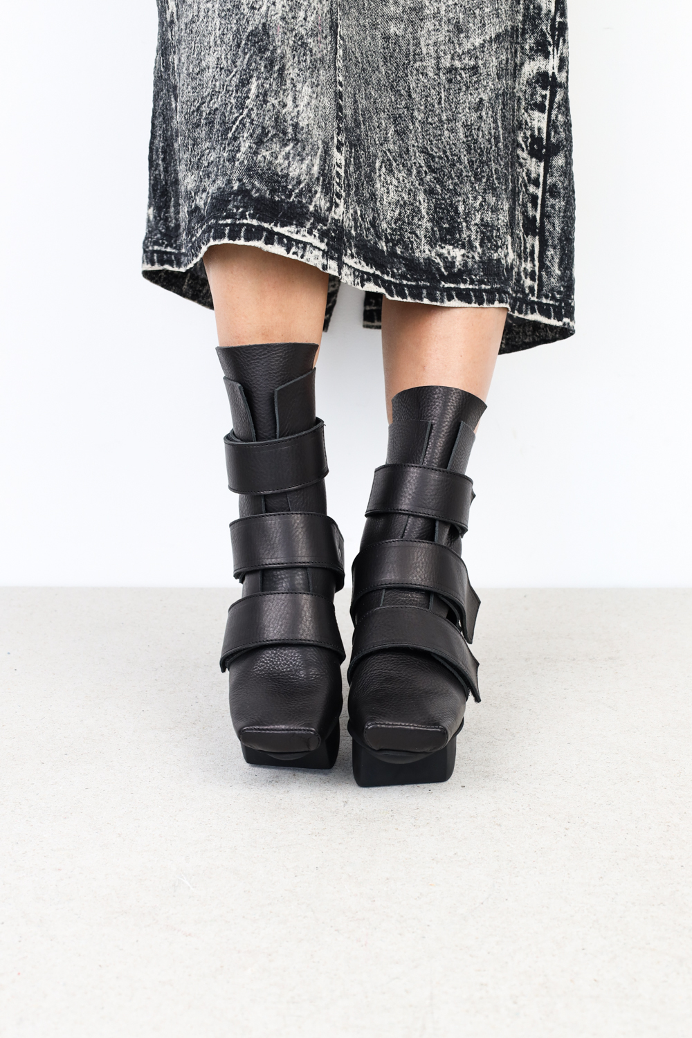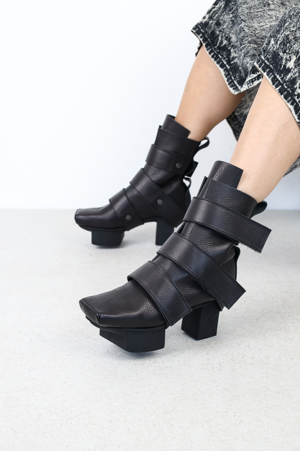 Trois sangles dominantes, fixées par des rivets métalliques et fermées par des bandes velcro, maintiennent le charette sur la semelle et au-dessus de la cheville.