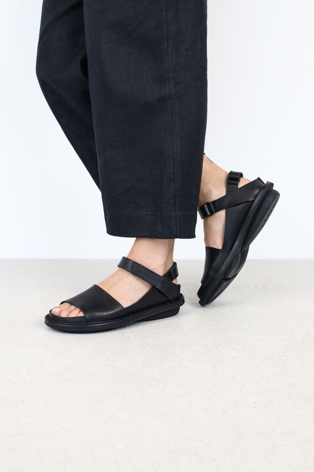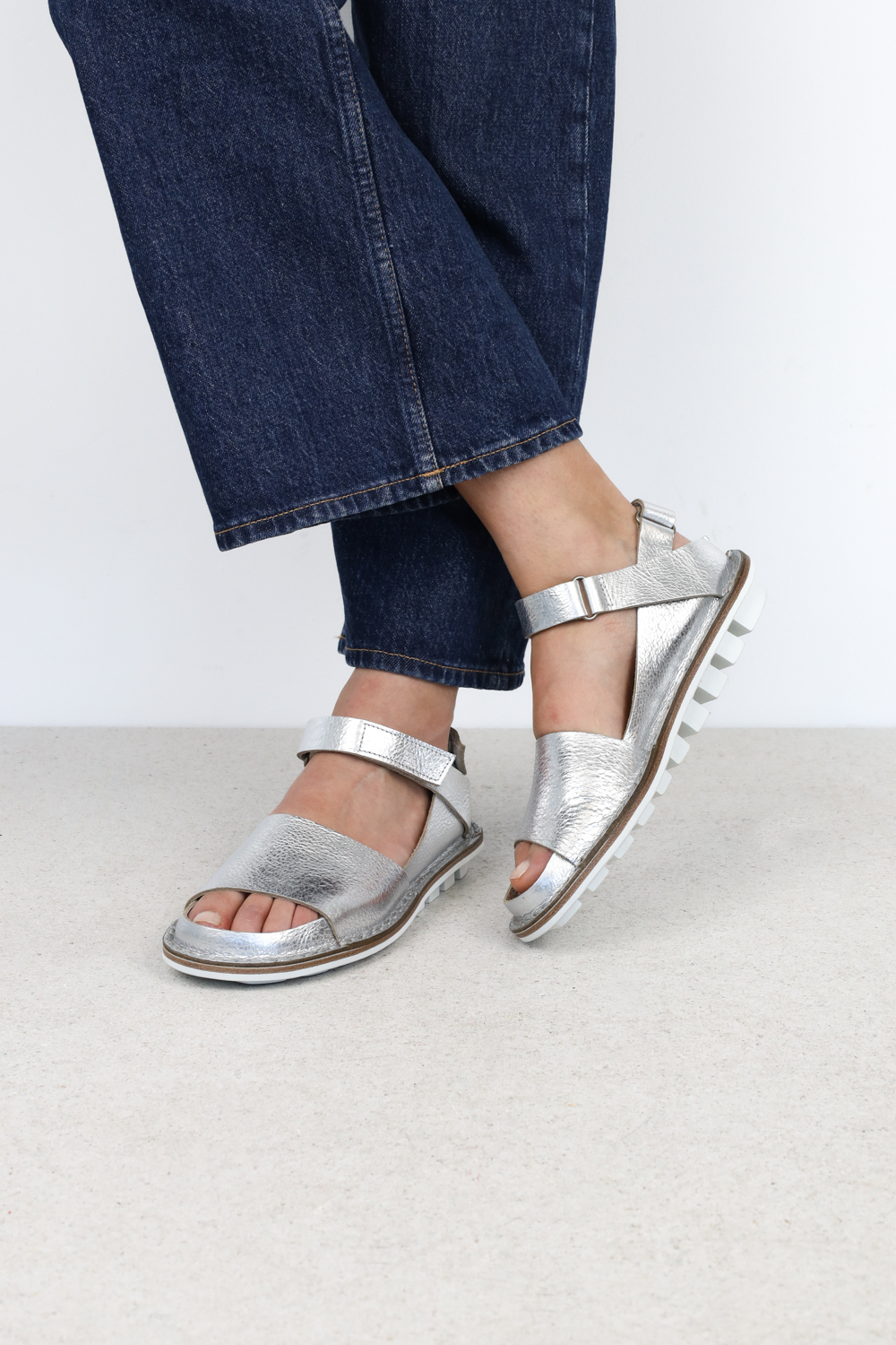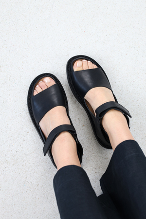 Sandale unisexe minimaliste avec une partie intérieure à fermeture velcro au talon, une fine bride avant et une deuxième bride à fermeture velcro sur le cou-de-pied. Les deux fermetures velcro permettent de régler le chaussant de manière optimale. La collection taille environ une pointure de plus que d'habitude.