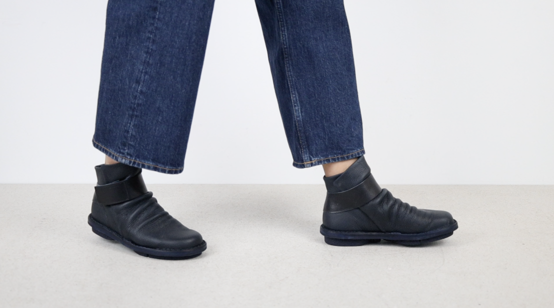 Die weichen Lederpartien dieses Anklebooties werden von einem geschwungenen festen Lederriemen mit Klettverschuss zusammengehalten.
