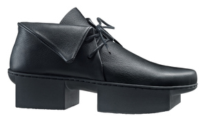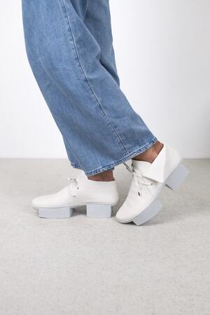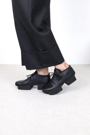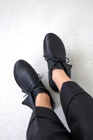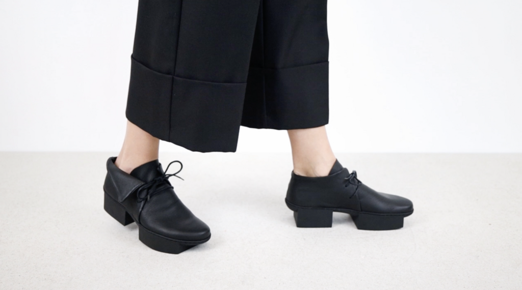 Dans cette chaussure basse souple, des formes droites et géométriques forment un élément de laçage asymétrique replié vers l’extérieur.