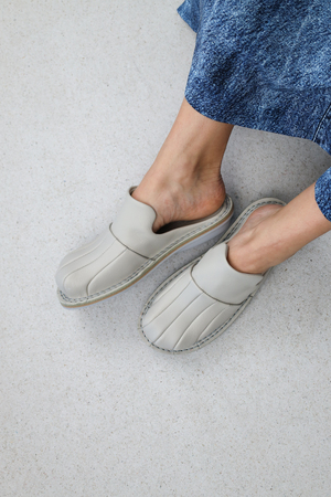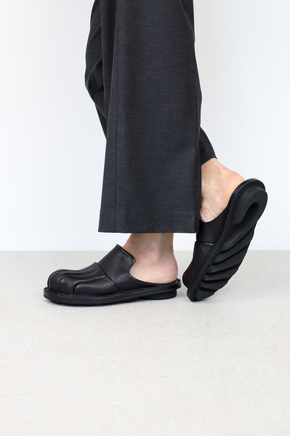 Le dessin fluide et finement travaillé de la partie avant confère à cette mule une silhouette particulière.