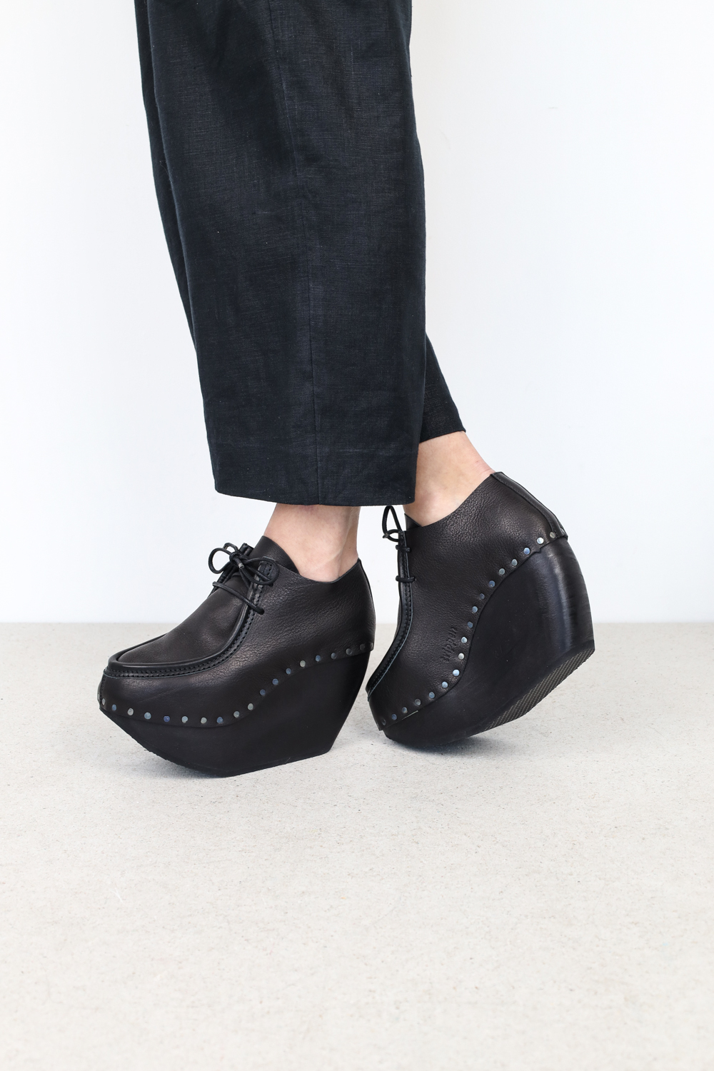 Les lignes classiques des mocassins développent une dynamique particulière sur la haute semelle ronde en bois de plateau.