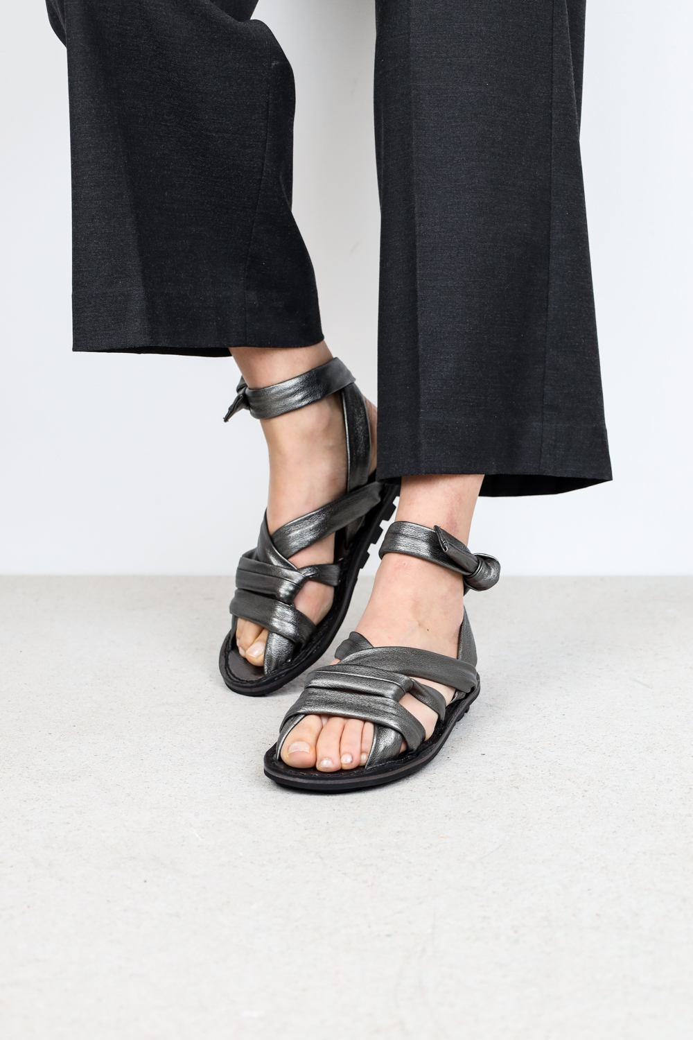 Sandale souple et élégante, avec des brides finement entrelacées formant un motif ludique sur le cou-de-pied et nouées autour de la cheville.