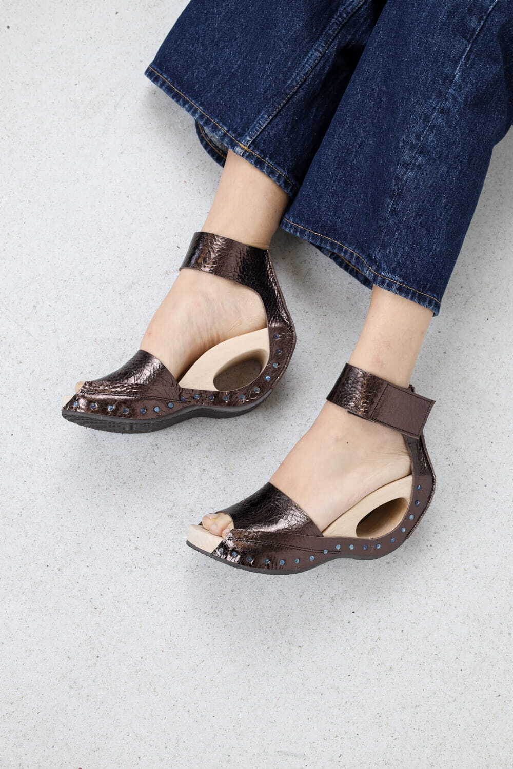 Depuis la bride sur l’avant-pied, le cuir de cette élégante sandale en bois est dirigé sous le trou distinctif du talon et au-dessus de la ligne du talon pour former une bride de cheville.
