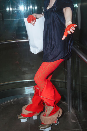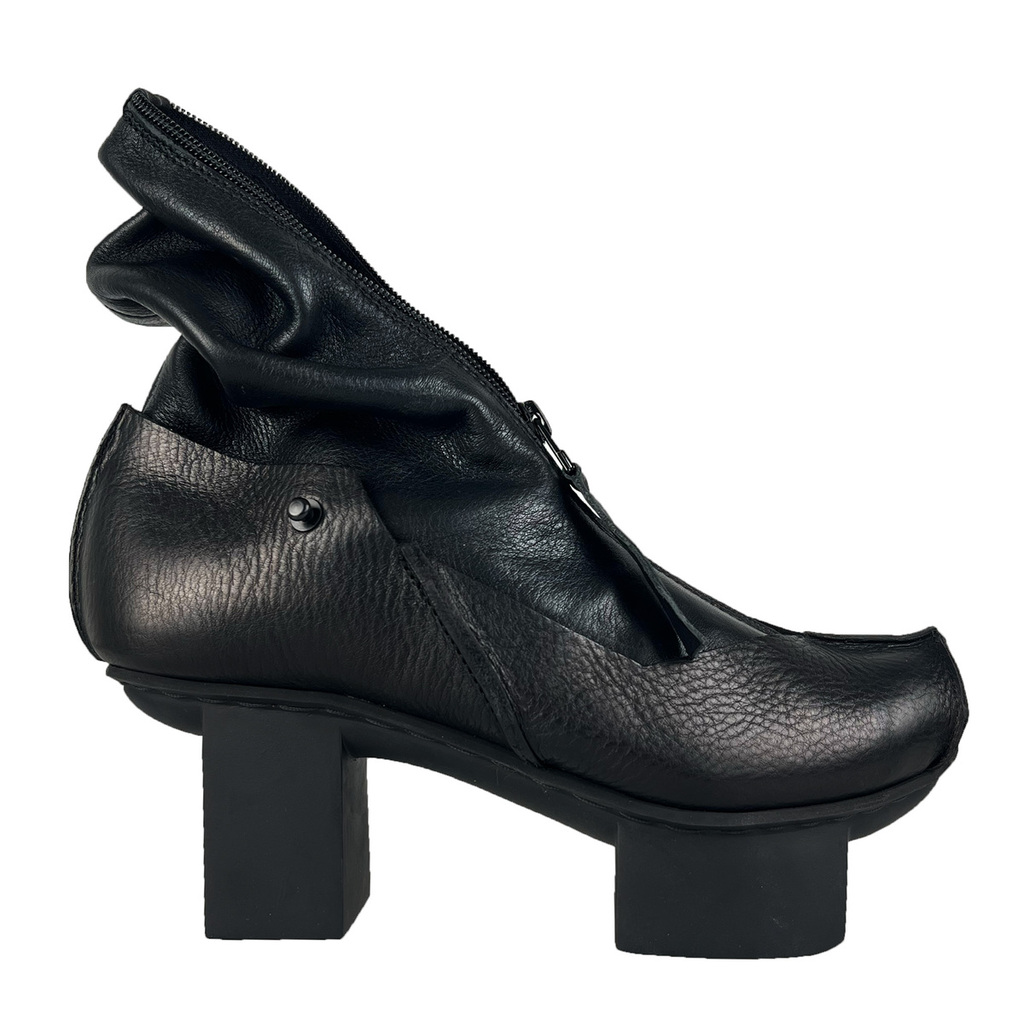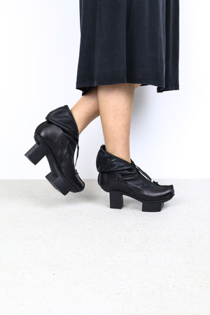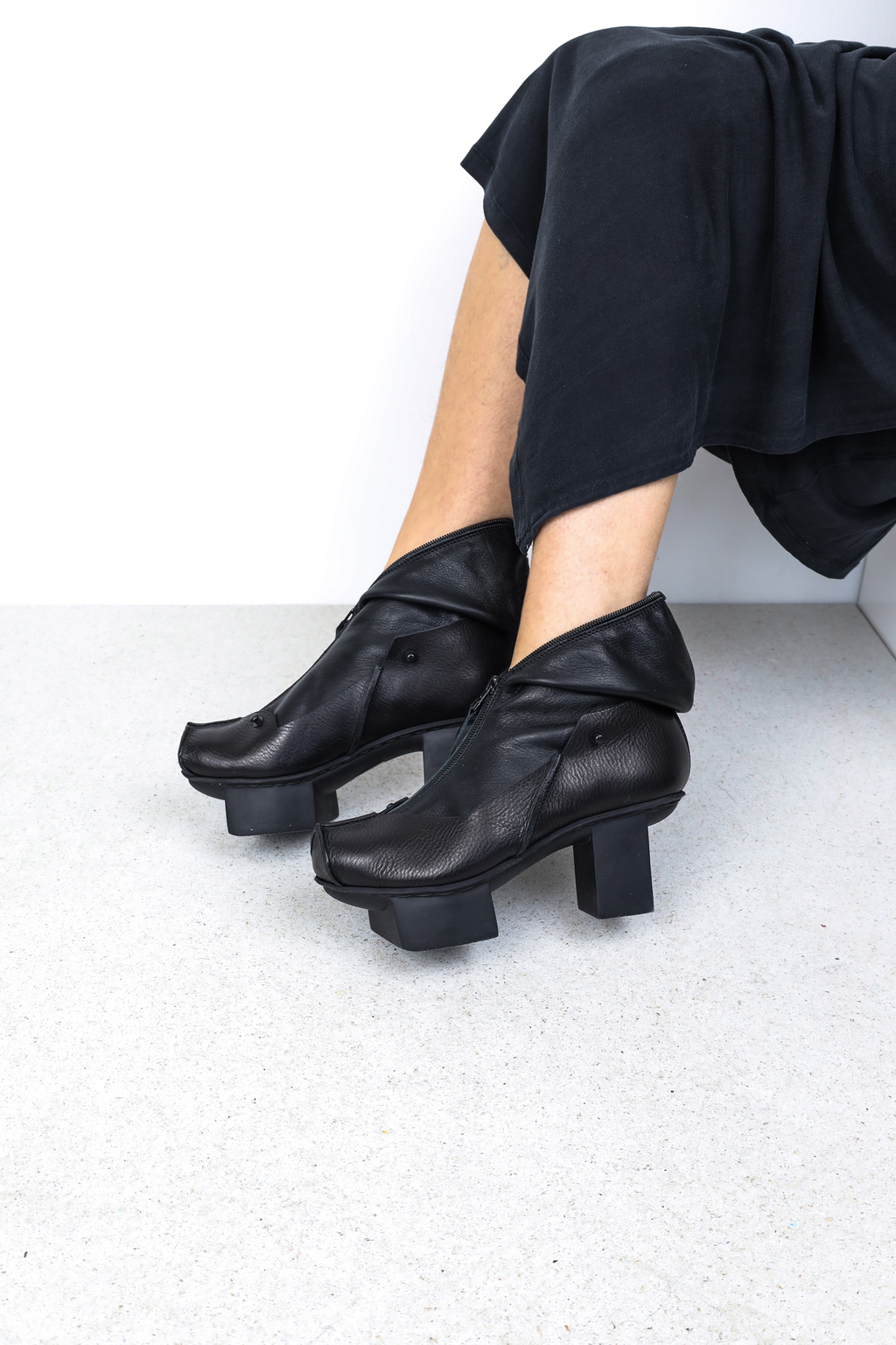 La silhouette graphique et architecturale de Hamur peut être prolongée sans couture par Sokkur — une guêtre sculpturale confectionnée à partir de laine bouillie islandaise et danoise issue de stocks dormants.