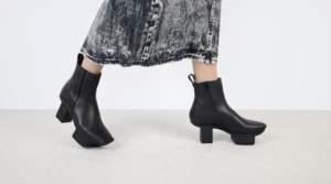 La pointe carrée, issue d'une technique de coupe et de pliage habile, joue avec le cubage de la semelle Happy, la bande rapportée prend discrètement contact avec la culture club