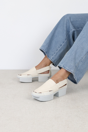 La longue feuille de loafer est montée sur une construction de sandale qui est passée autour du talon avec une lanière à fermeture velcro.