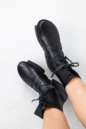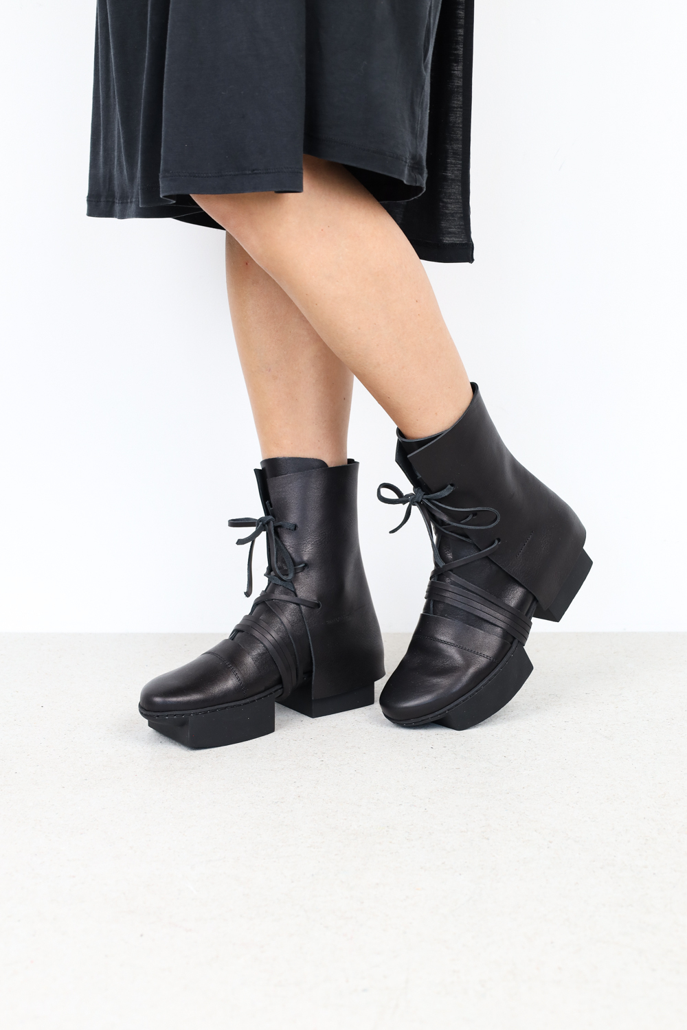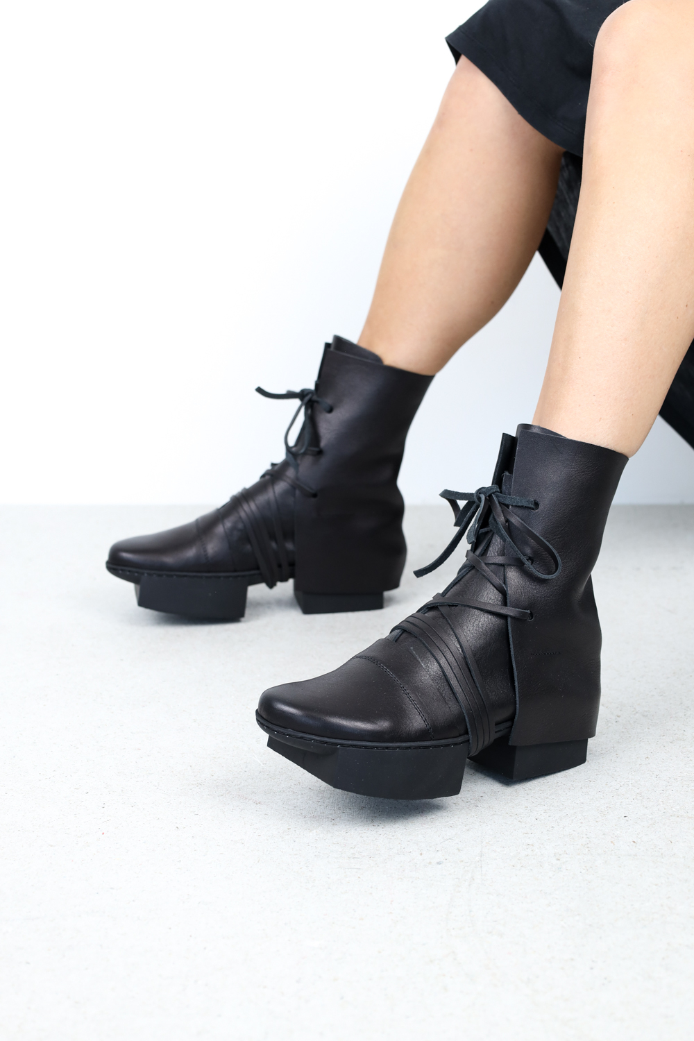 Bottes à plateforme avant-gardistes avec des éléments graphiques et des lacets en cuir inhabituels
