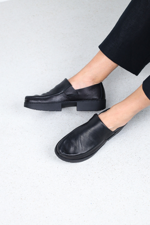 Loafer classique avec une feuille souple et légèrement pliée dans laquelle un élastique est intégré à l'extrémité.