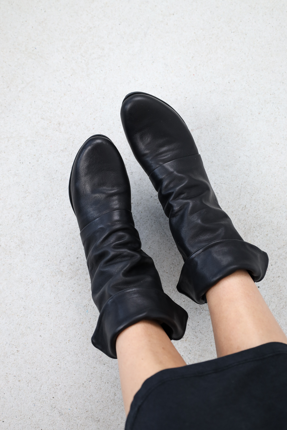 Botte souple à mi-hauteur qui se plie en douceur sur le cou-de-pied. La partie avant de la tige, remarquablement relevée, promet une tenue particulière. Doublée