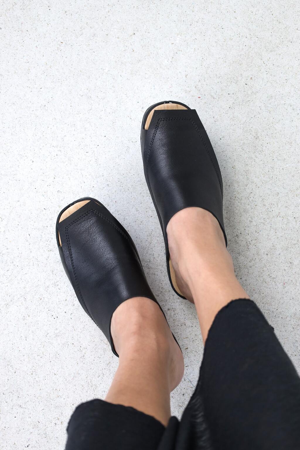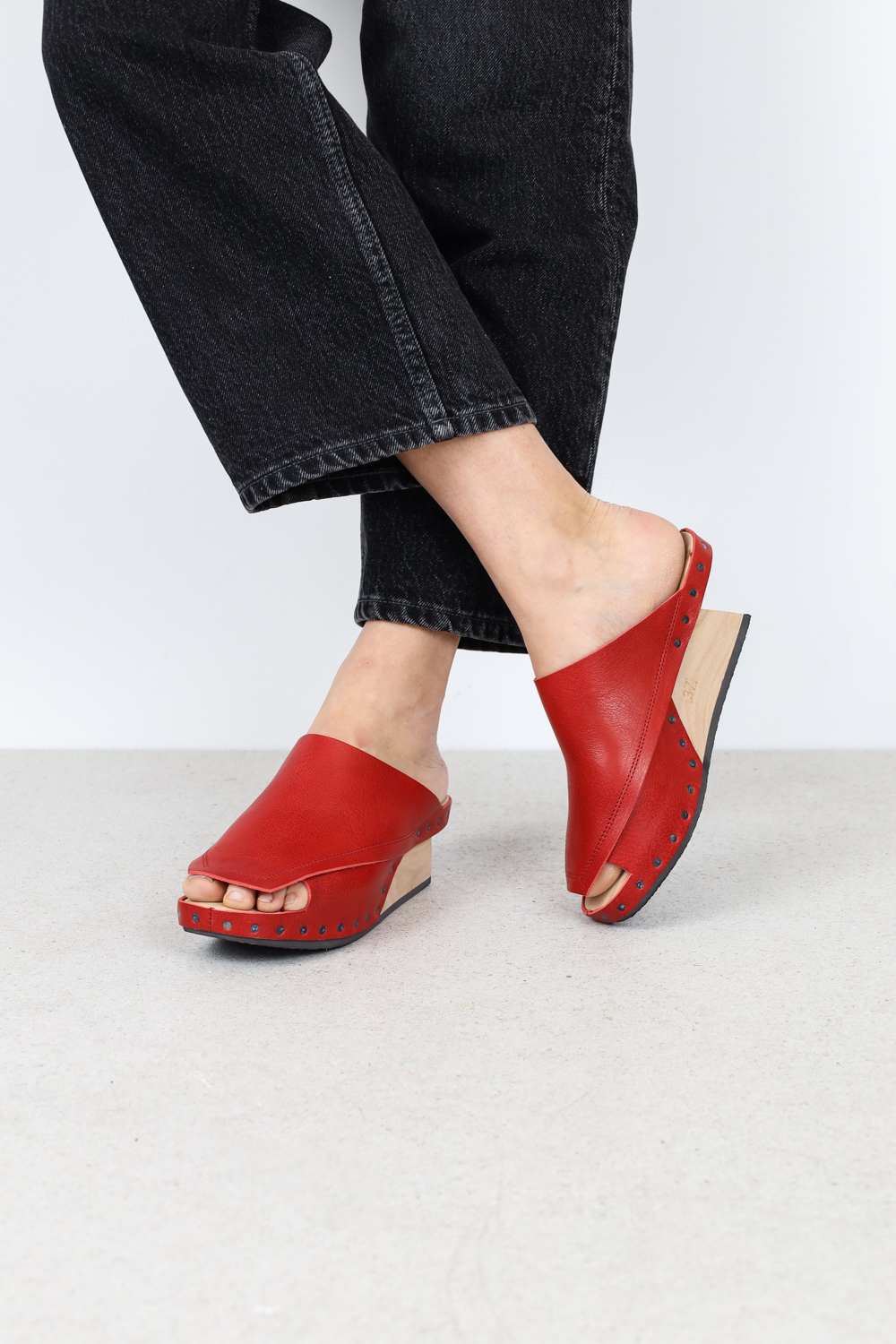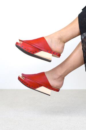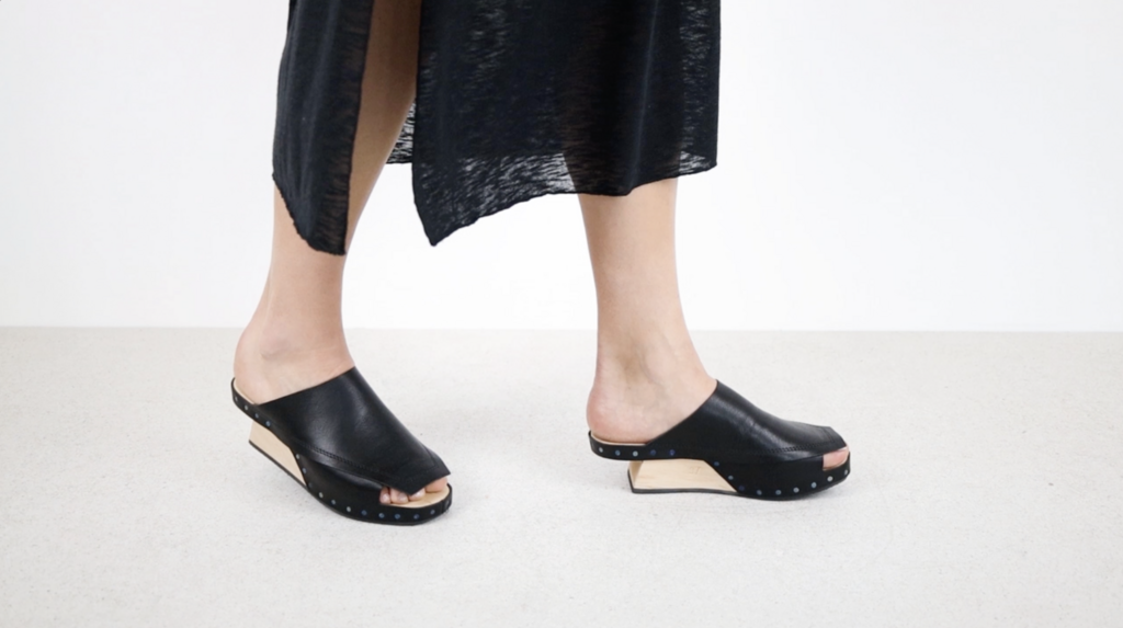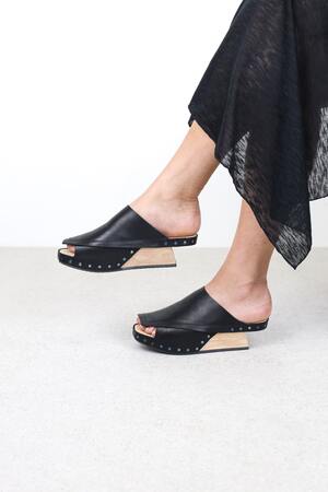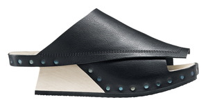 Sabot en bois à talon évidé, dont les couches de cuir se chevauchent de manière complexe en formes graphiques sur le pied et la semelle.