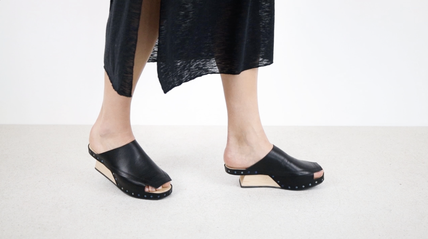 Holzclog mit ausgeschnittenem Absatz, dessen Lederschichten sich komplex in grafischen Formen an Fuss und Sohle überschneiden.