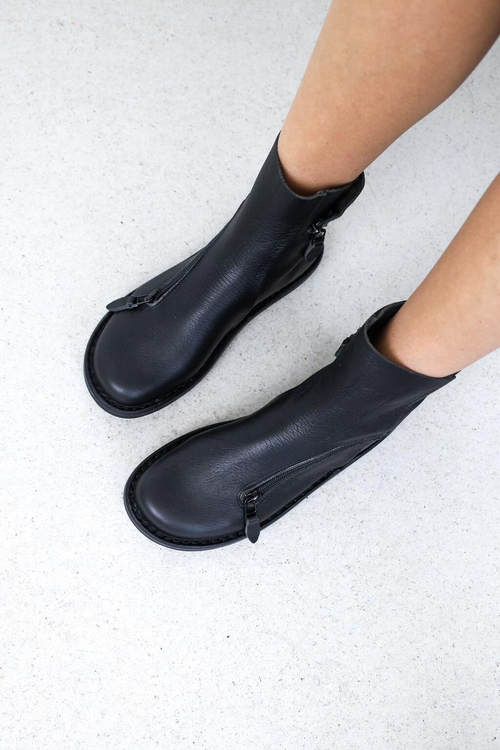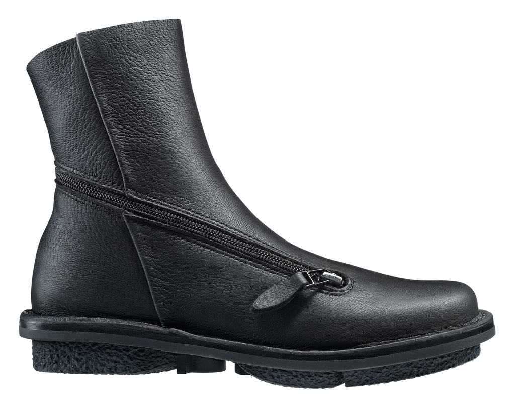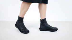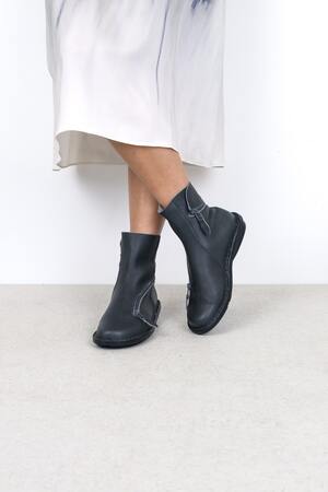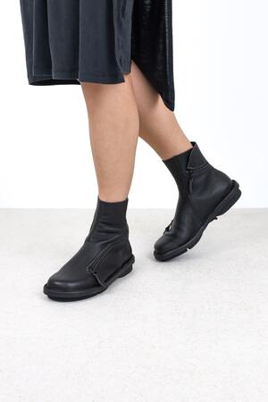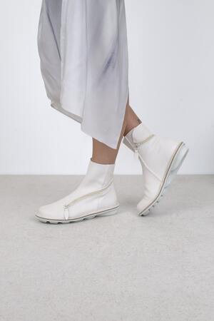 Bottine souple dotée d’une fermeture éclair qui part de manière ludique de la plante du pied et contourne le talon, pouvant être ouverte par les deux extrémités selon les conditions météorologiques.