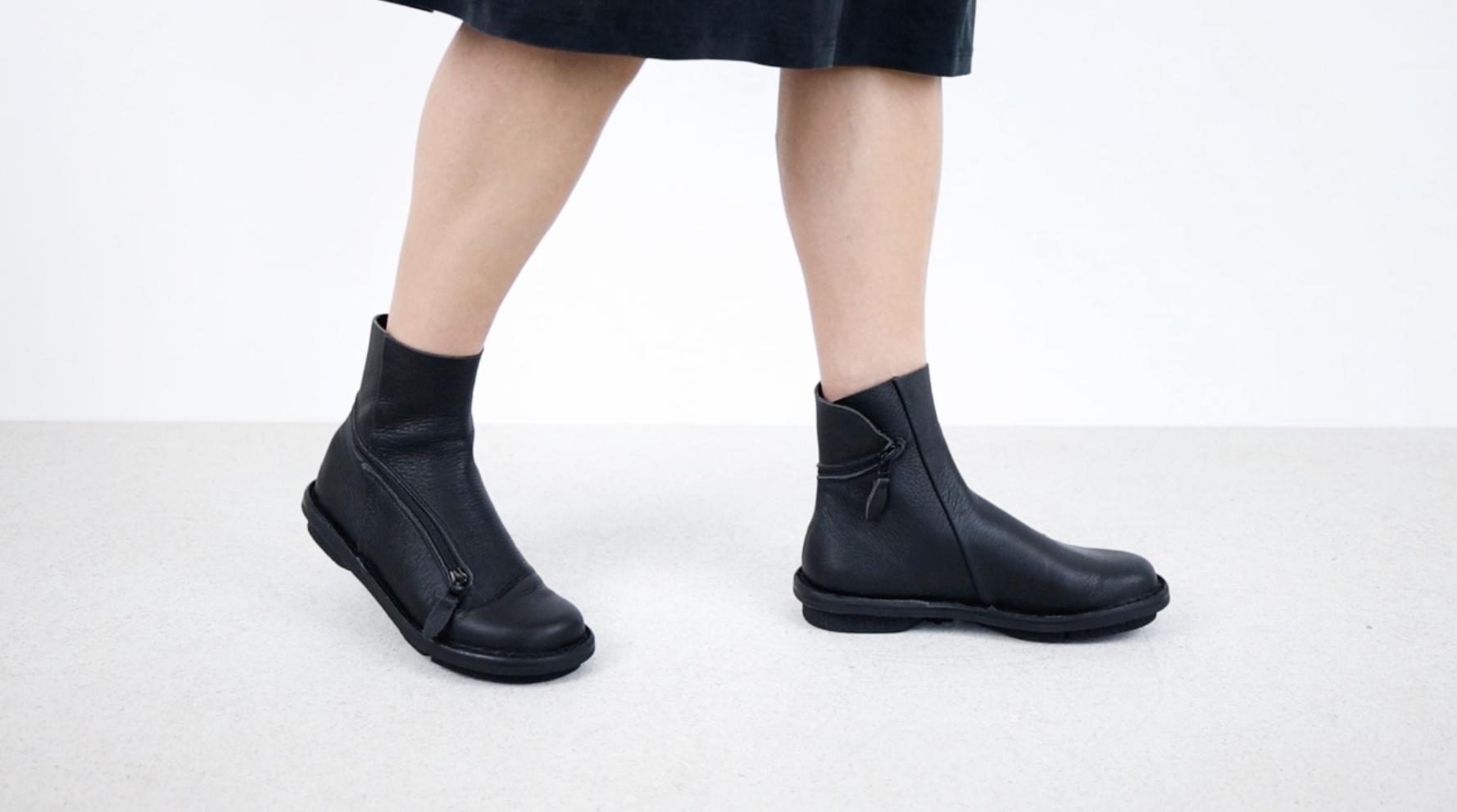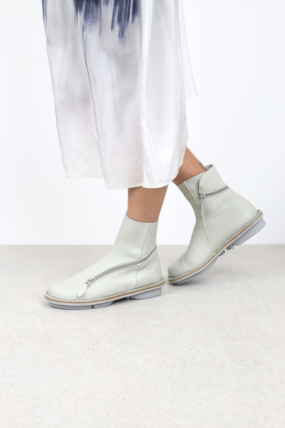 Weiche Stiefelette mit einem Reißverschluss, der spielerisch vom Ballen kommend um die Ferse herum geführt wird und je nach Wetterlage von beiden Enden geöffnet werden kann.
