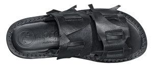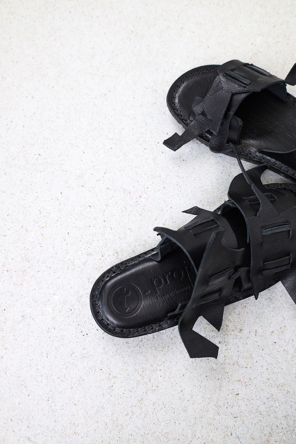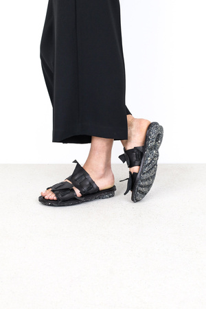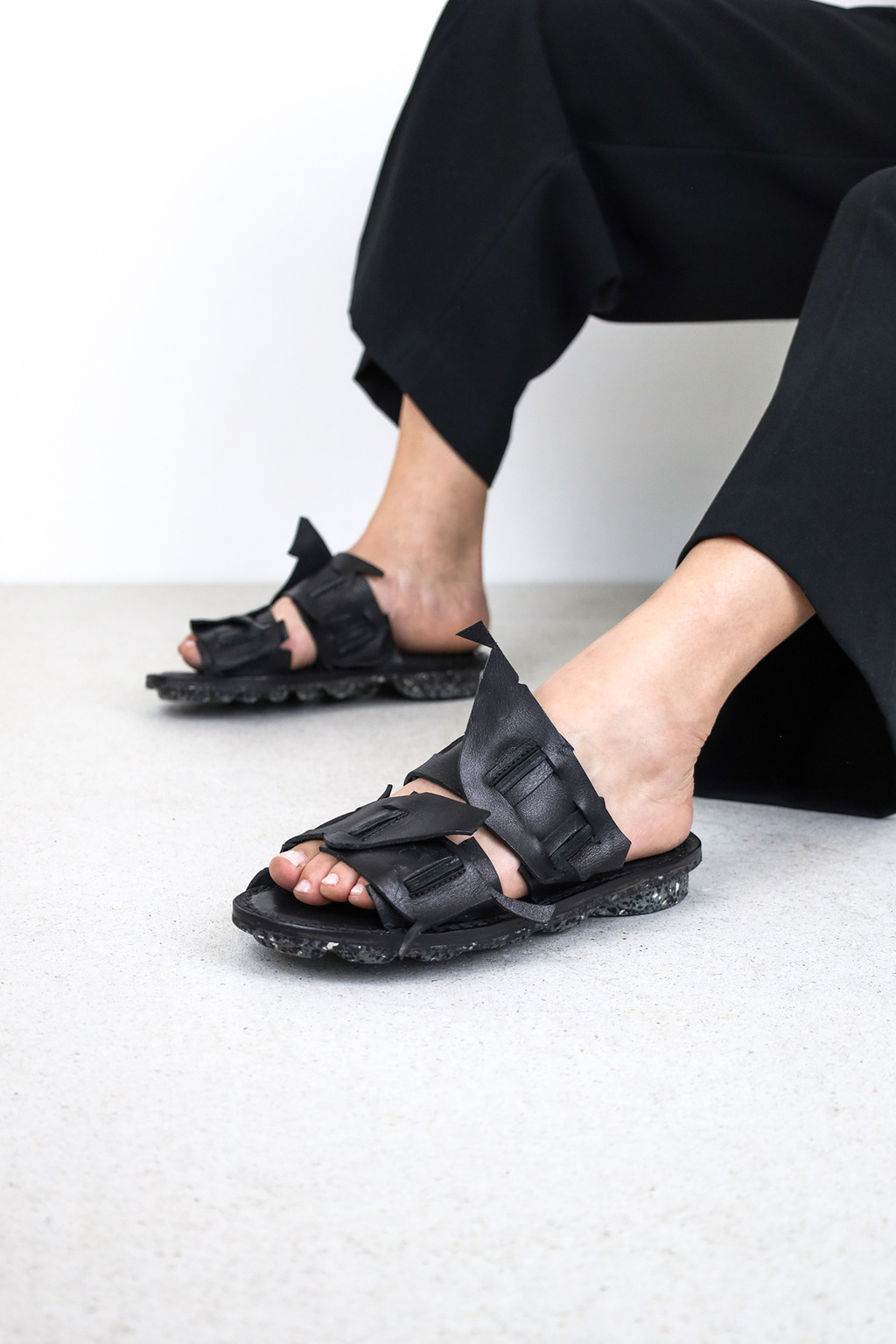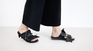 Un slipper artisanal à deux brides, dont les éléments sont façonnés avec art à partir de chutes de cuir réutilisées, comme une mosaïque de petites pièces imbriquées, puis soigneusement assemblées et cousues.