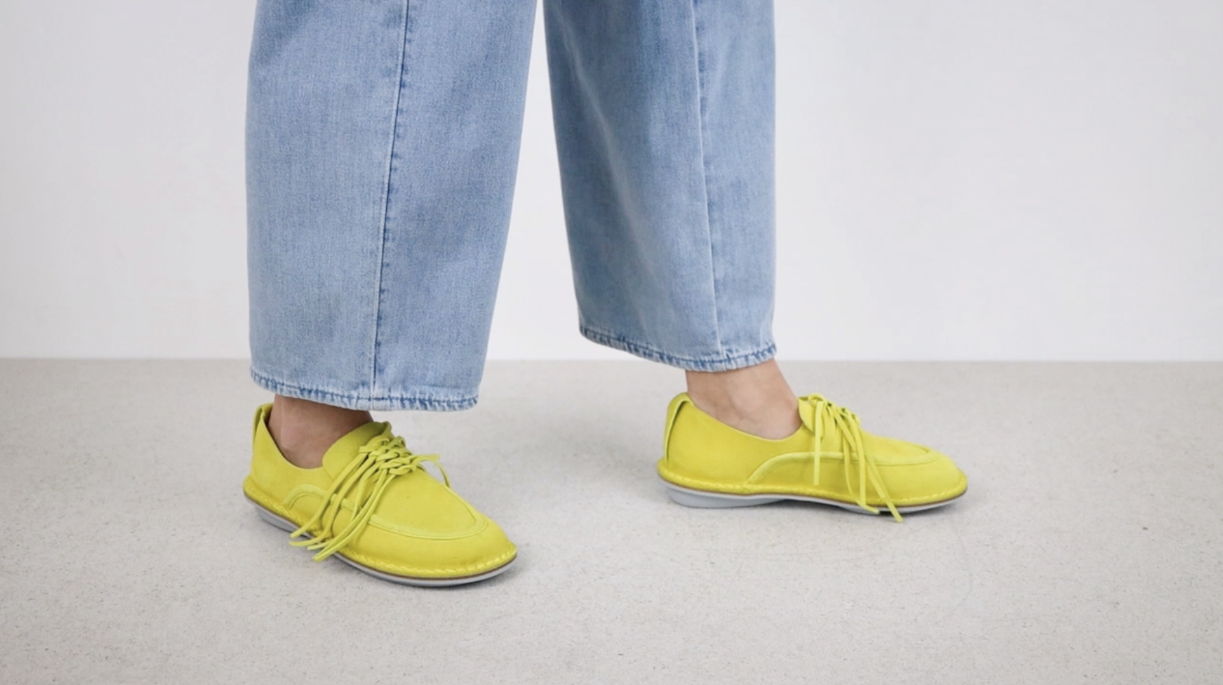 Verspielte Interpretation eines Mokassin mit vielen Knötchen über einem verdeckten Gummizug, der den Fuss hält.