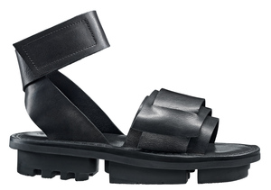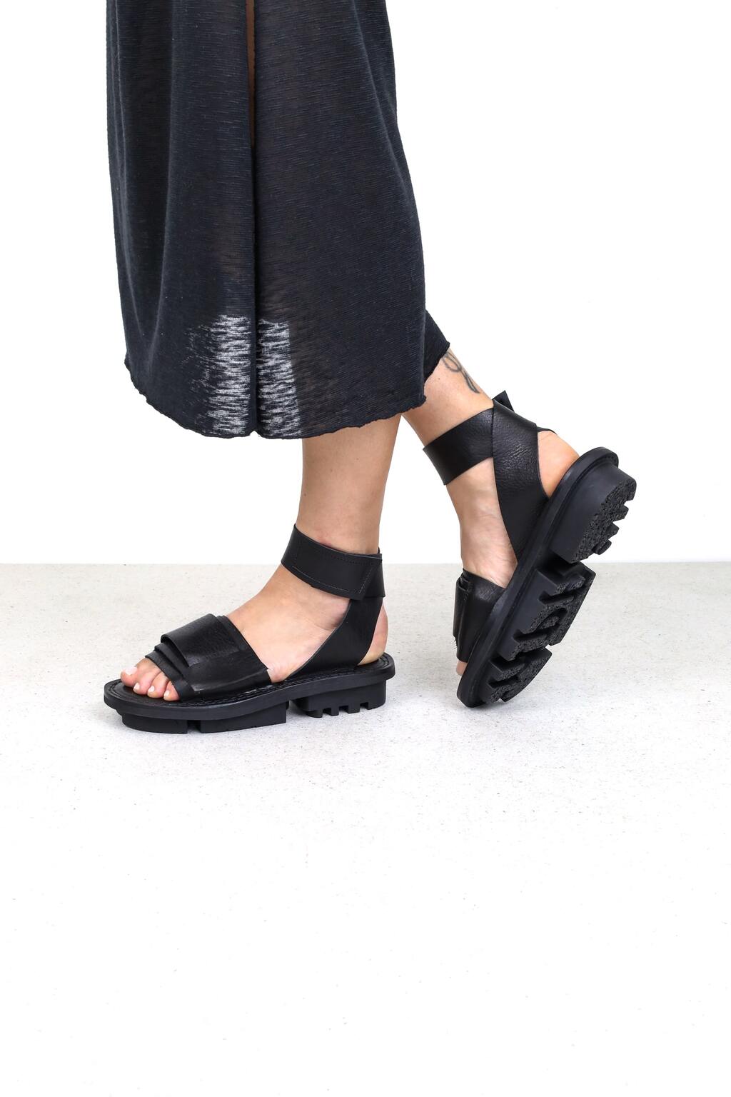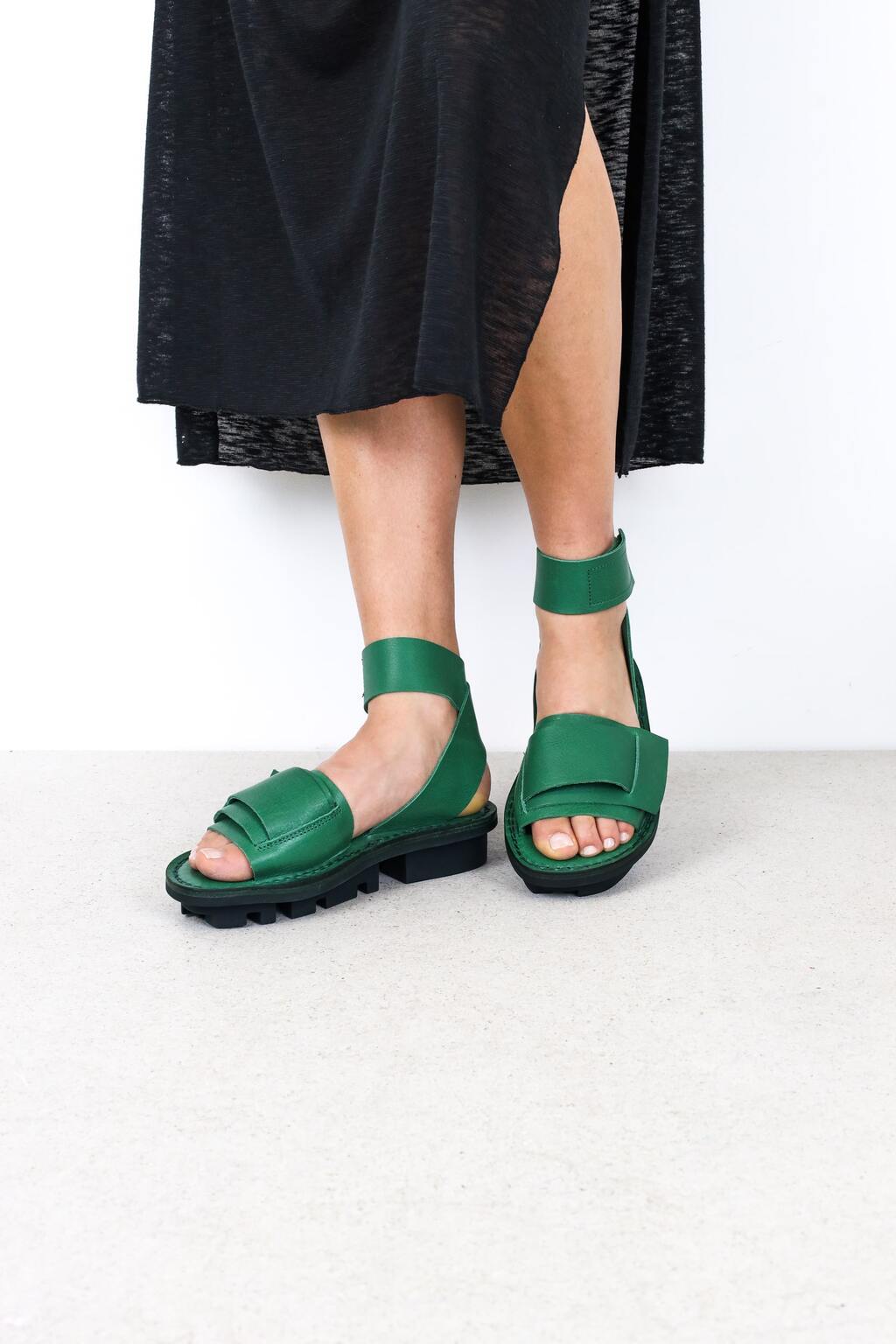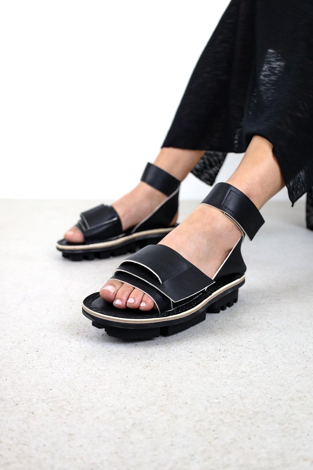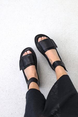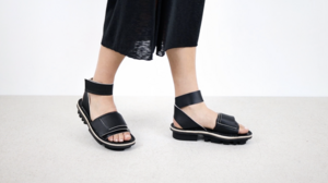 Une construction déstructurée de larges brides maintient l’avant-pied, tandis que de sobres brides à fermeture auto-agrippante se croisent derrière le talon.
