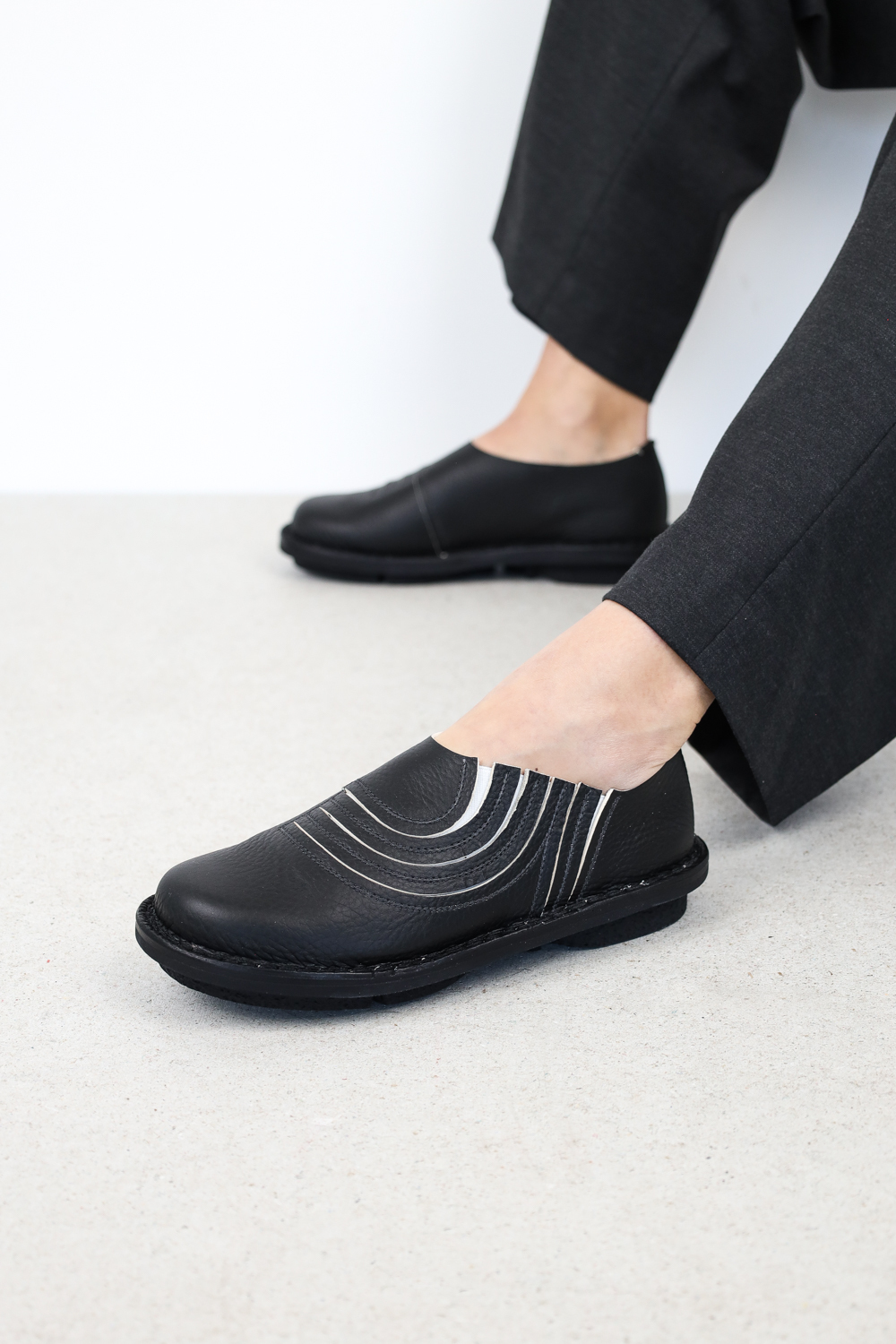 Chaussure unisexe minimale à enfiler pour tous les jours, avec des lignes en forme d’arc-en-ciel qui s’étendent sur un élastique caché.