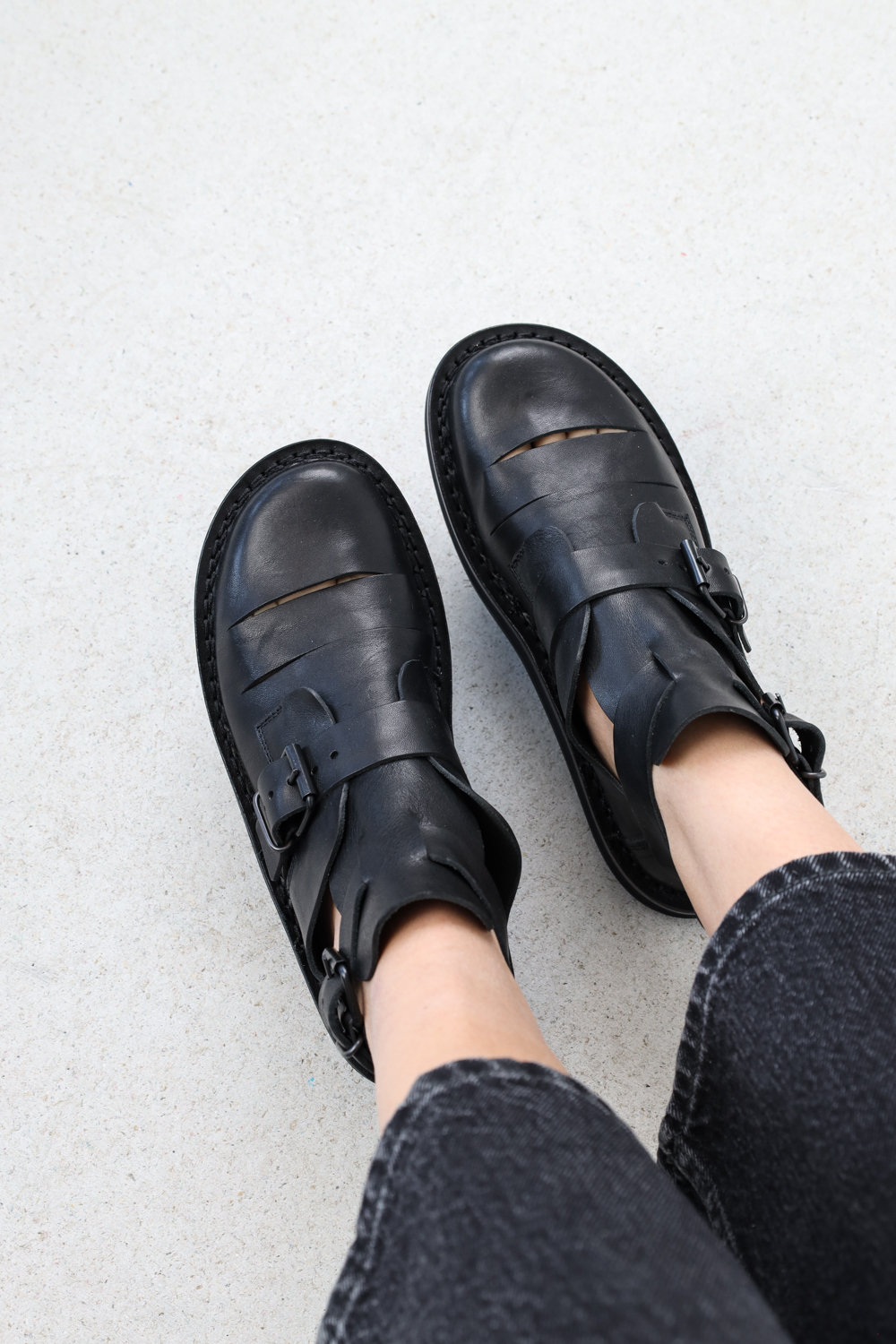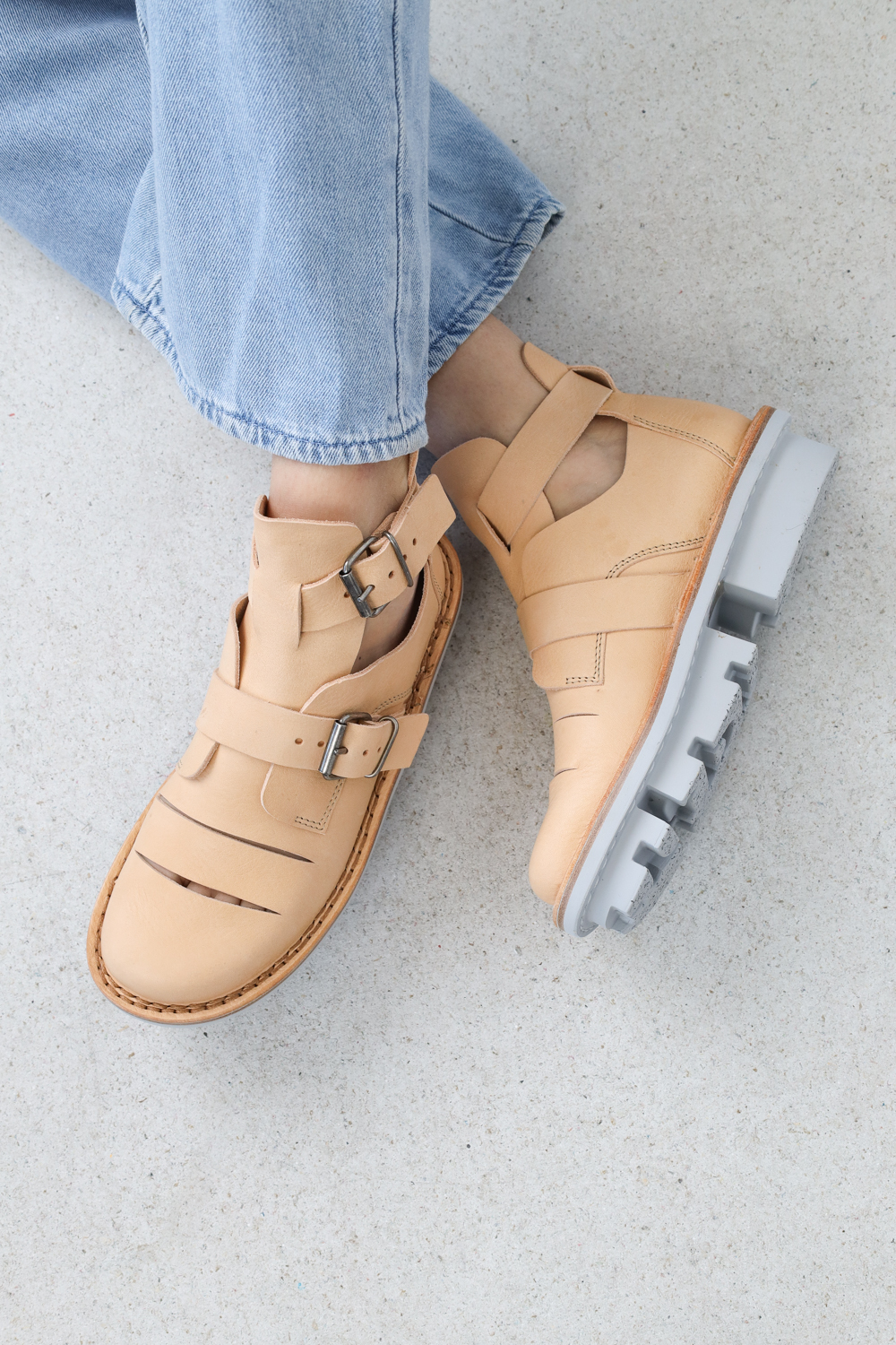 Sandale robuste à la hauteur de la cheville qui tient ses promesses : une allure affirmée. Les fentes dans la feuille et les deux boucles qui ferment les quartiers ont quelque chose de martial, souligné par la semelle compensée Trace.