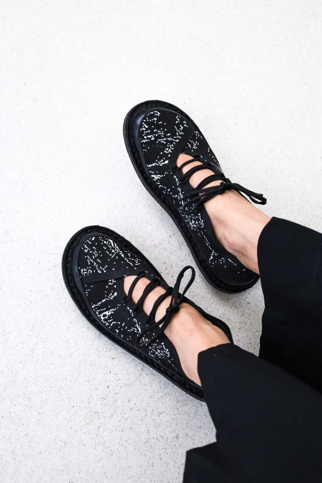 À la recherche de matériaux circulaires pour le dessus, nous avons commencé à expérimenter le tricotage. Pour les fils, nous sommes tombés sur un fabricant espagnol qui récupère les matériaux synthétiques (70% de bouteilles PET recyclées et 30% de plastique océanique). Nous avons l'espoir qu'il puisse également intégrer nos petites quantités dans ce processus circulaire après utilisation. Le développement de la coupe tridimensionnelle est illustré par des motifs visibles, des trous de laçage sont intégrés et des poches pour le renfort sont également tricotées. Lors de ces premières étapes, nous avons équipé la chaussure basse d'un bord en caoutchouc pour qu'elle réponde à nos exigences de durabilité et nous avons monté le tout sur notre construction Closed avec notre semelle recyclée. Le chemin sera encore long avant que nous réussissions à tricoter toute la chaussure dans un seul matériau. Les lacets sont à nouveau tricotés avec le nouveau fil.