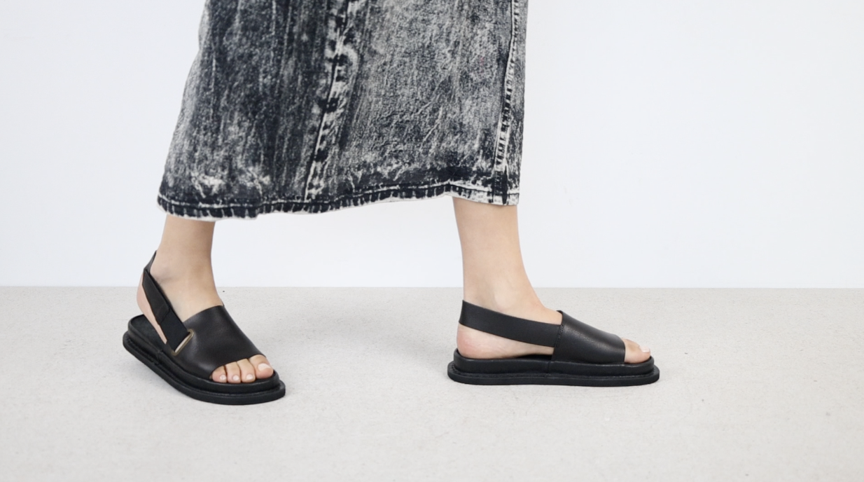 Sandale unisexe simple avec une sangle élastique au talon qui passe par un œillet et une fermeture par bande velcro.