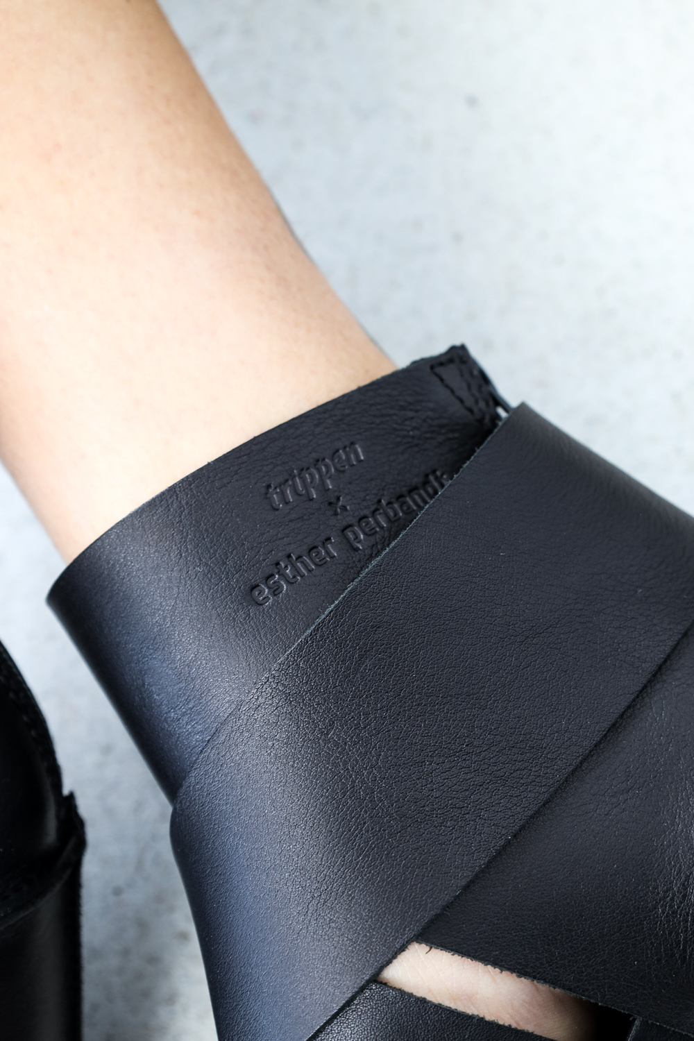 Der in Kooperation mit ESTHER PERBANDT entstandene Holzschuh Soleil ist eine Keilsandale, die aus zwei breiten Riemenkreuzen aufgebaut ist und mit einer breiten Schnalle an der Seite geschlossen wird. Ein zusätzliches Band um die Fessel wird durch einen Reißverschluss an der Ferse unterbrochen.