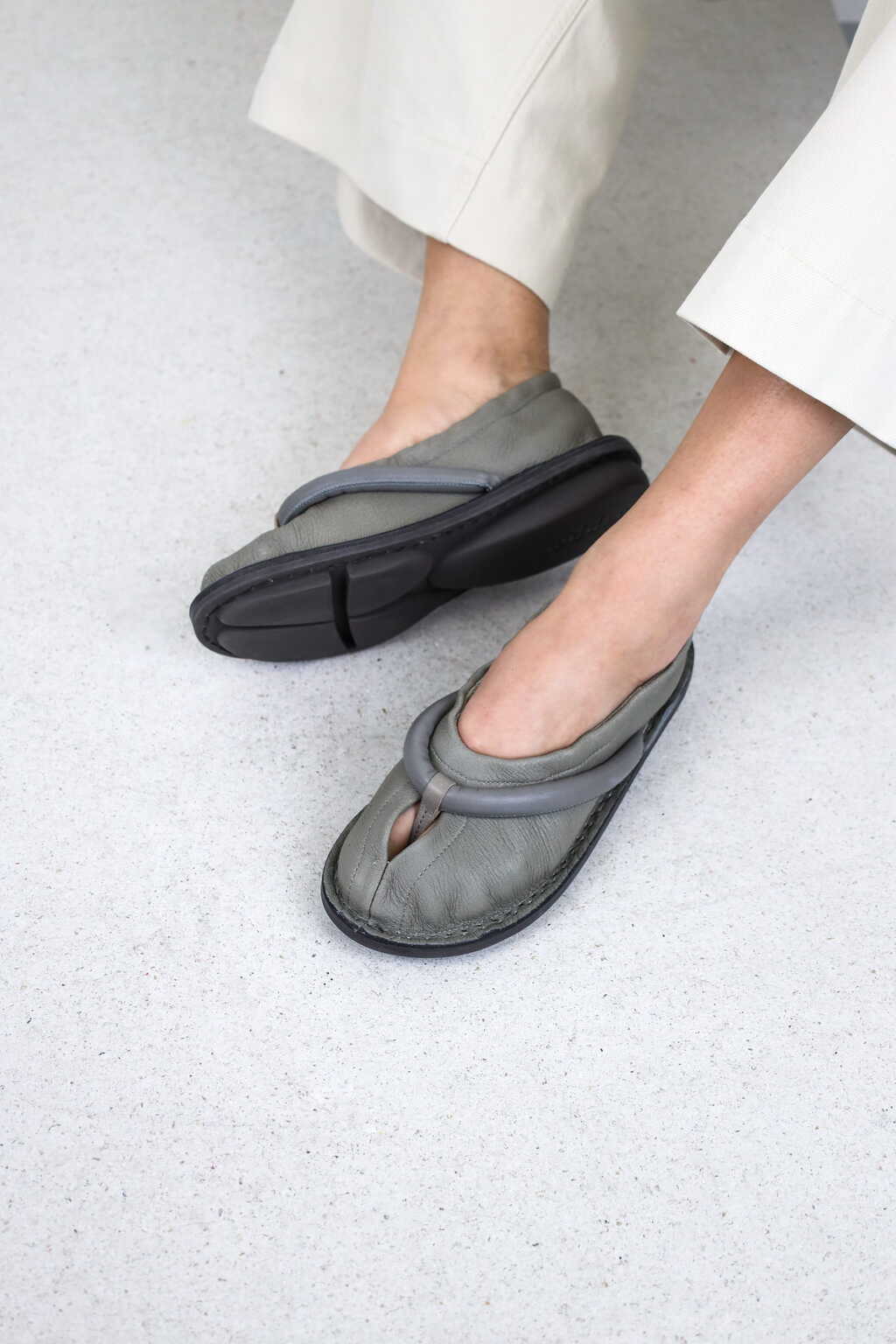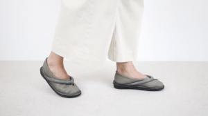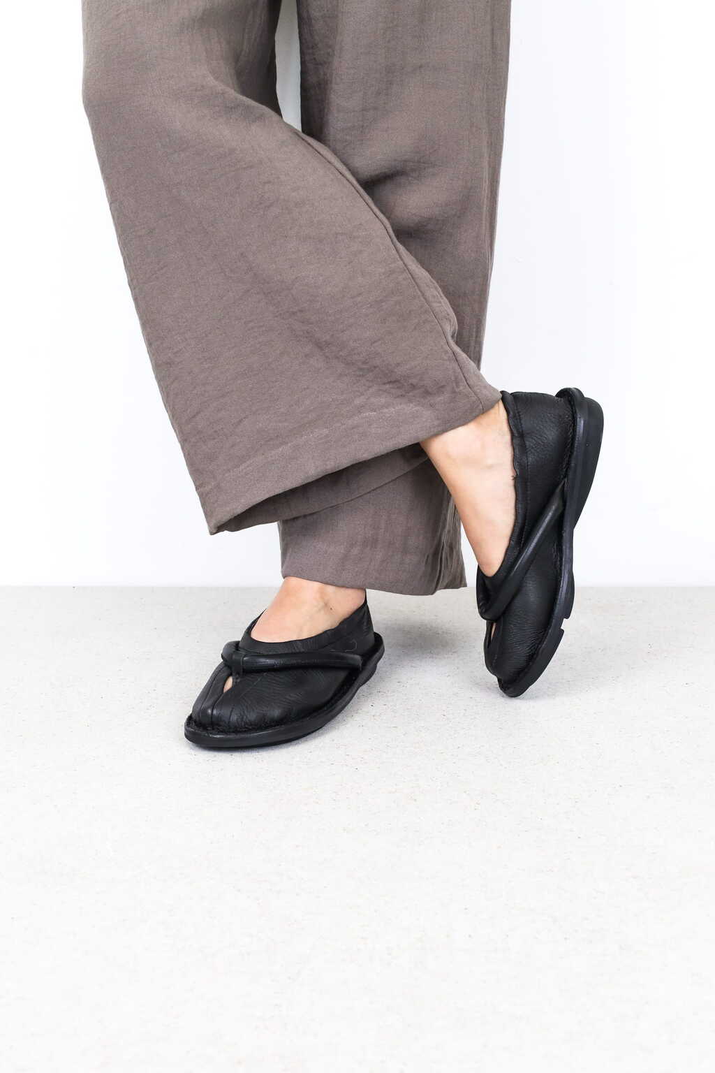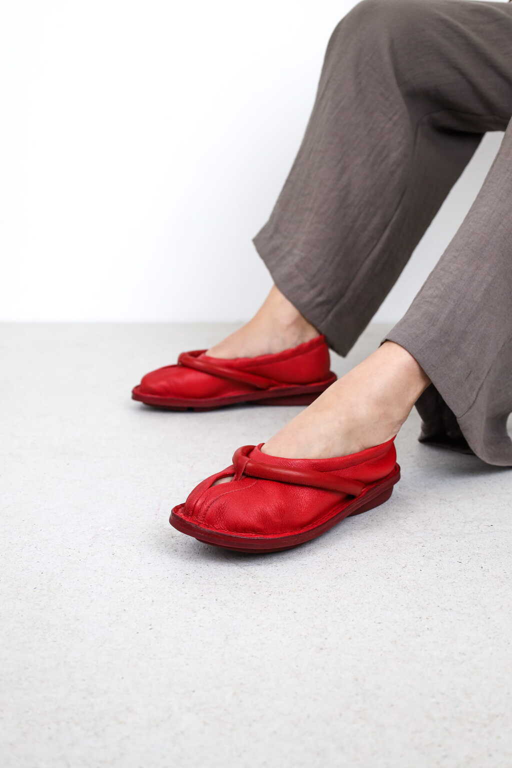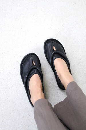 Cette ballerine souple à enfiler est associée à une bride de type tong rembourrée, créant une nouvelle esthétique inspirée du Tabi.