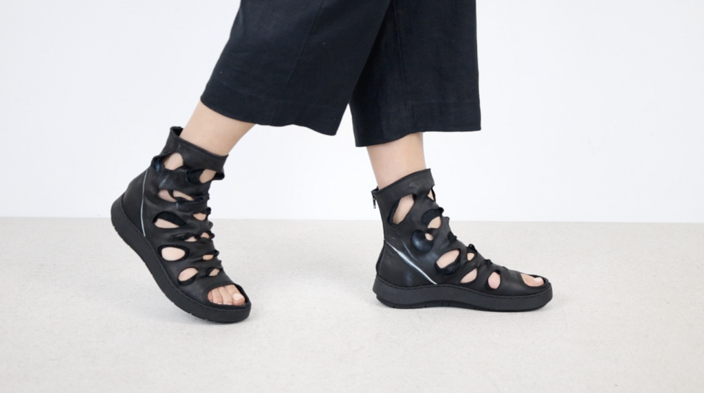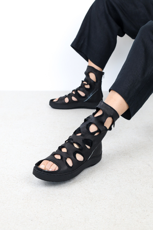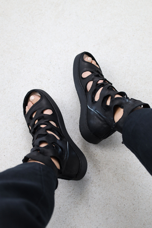 "Sandale expérimentale unisexe en cuir \"lavato\"avec une longue fermeture à glissière au talon. Les ouvertures en forme de cercle et d'ellipse