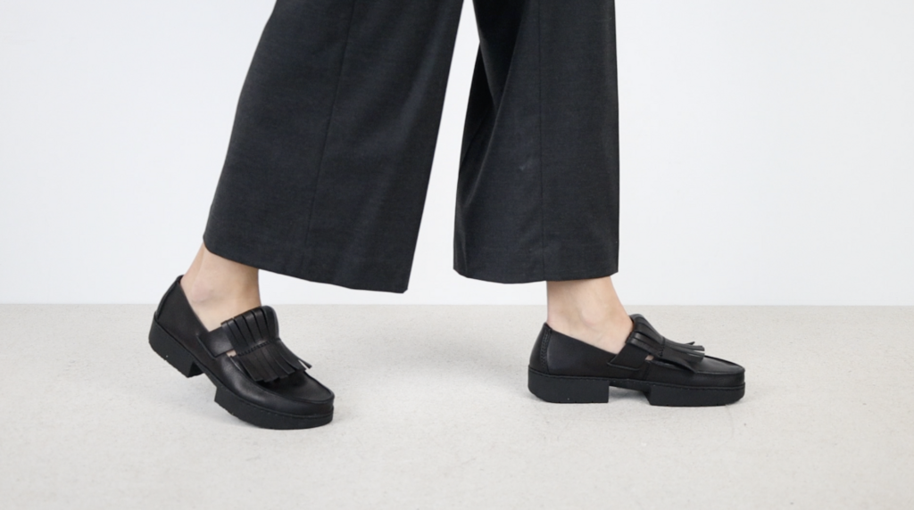 Modèle unisexe dans le style d'un loafer classique, avec un décor de franges sur la claque. La couture en forme d'écrasement autour de la feuille et la finition sans bout avant donnent au modèle une forme légèrement pointue. Dissimulée sous les franges, une bande élastique traverse le cou-de-pied.