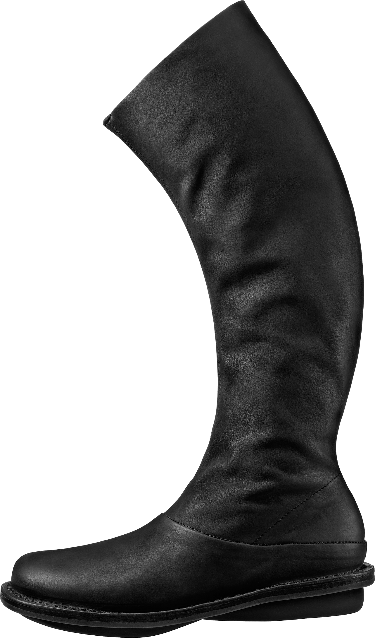 Les solutions de coupe expérimentales qui créent une plasticité exceptionnelle sont un thème caractéristique de Trippen. Dans cette botte qui monte jusqu'au genou et qui est dotée d'une fermeture à glissière à l'intérieur, la tige souple et sinueuse tombe en plis doux sous le mollet en suivant les indications anatomiques