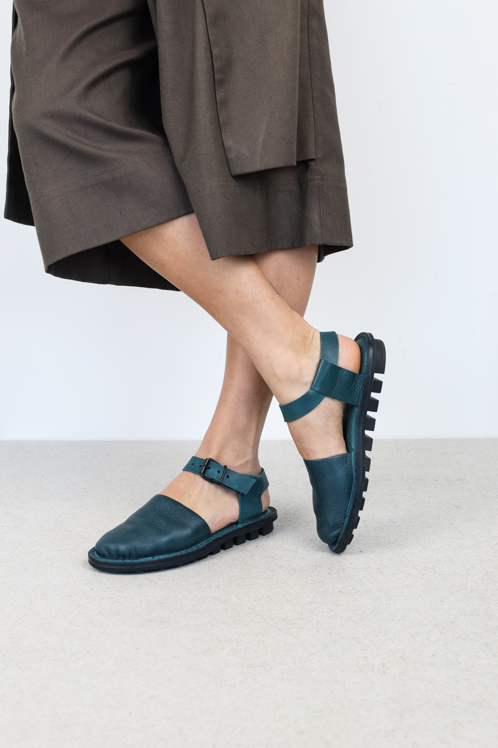 Un drapé lâche sur les orteils en cuir de cerf doux suit une construction classique à lanières sur le cou-de-pied et le talon.