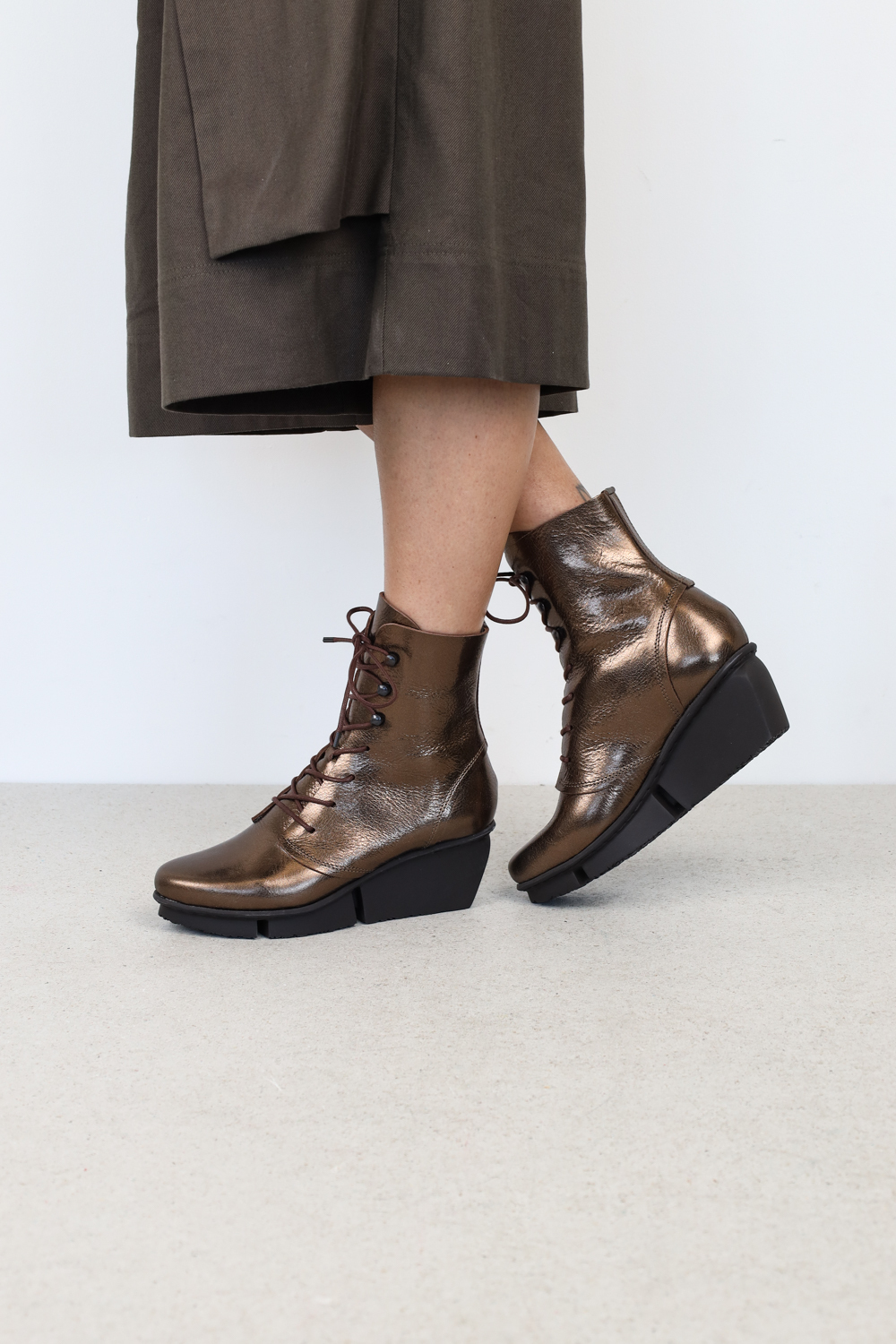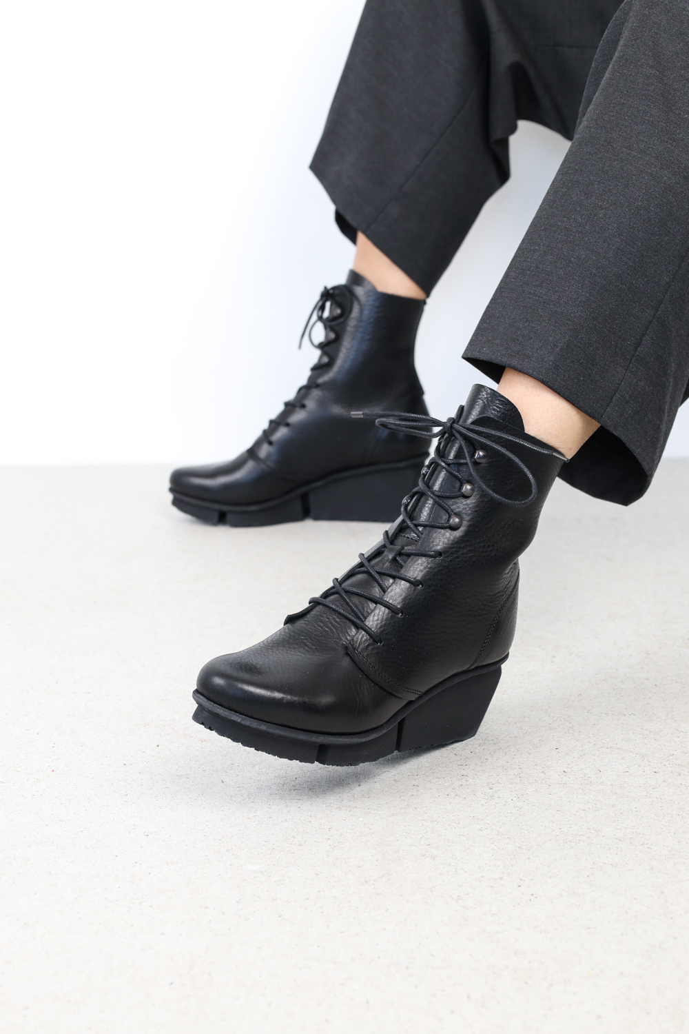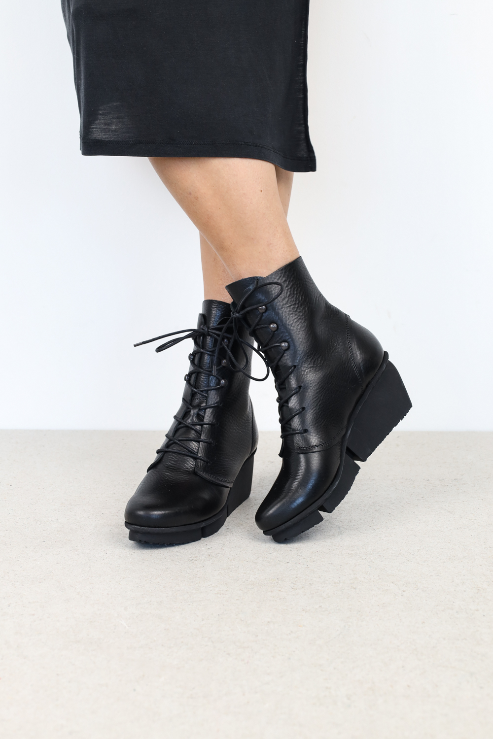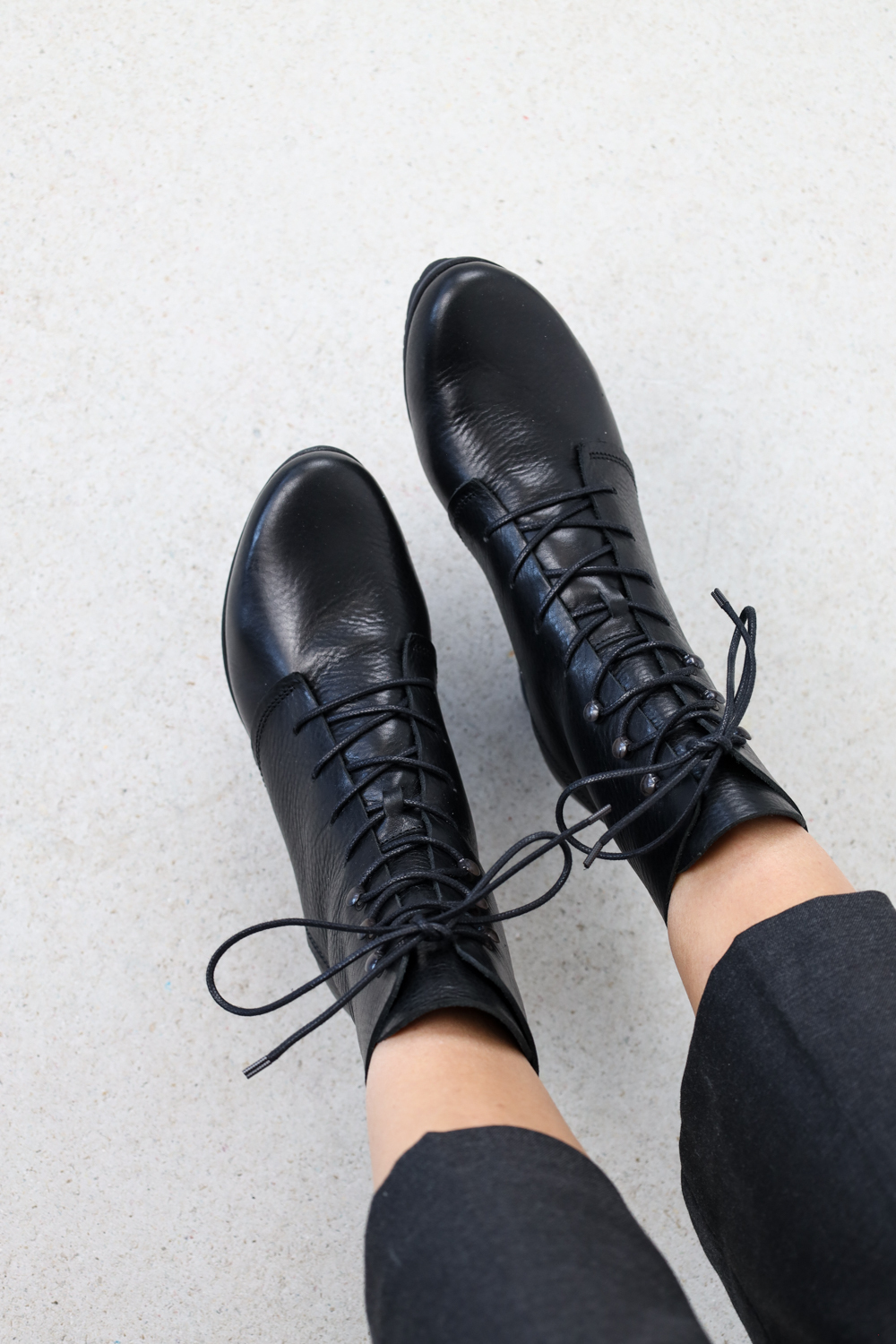 Bottes à lacets classiques et élégantes sur une semelle de gravillon. Le laçage passe par quatre trous dans la partie inférieure et est guidé par trois crochets à lacet dans la partie supérieure.