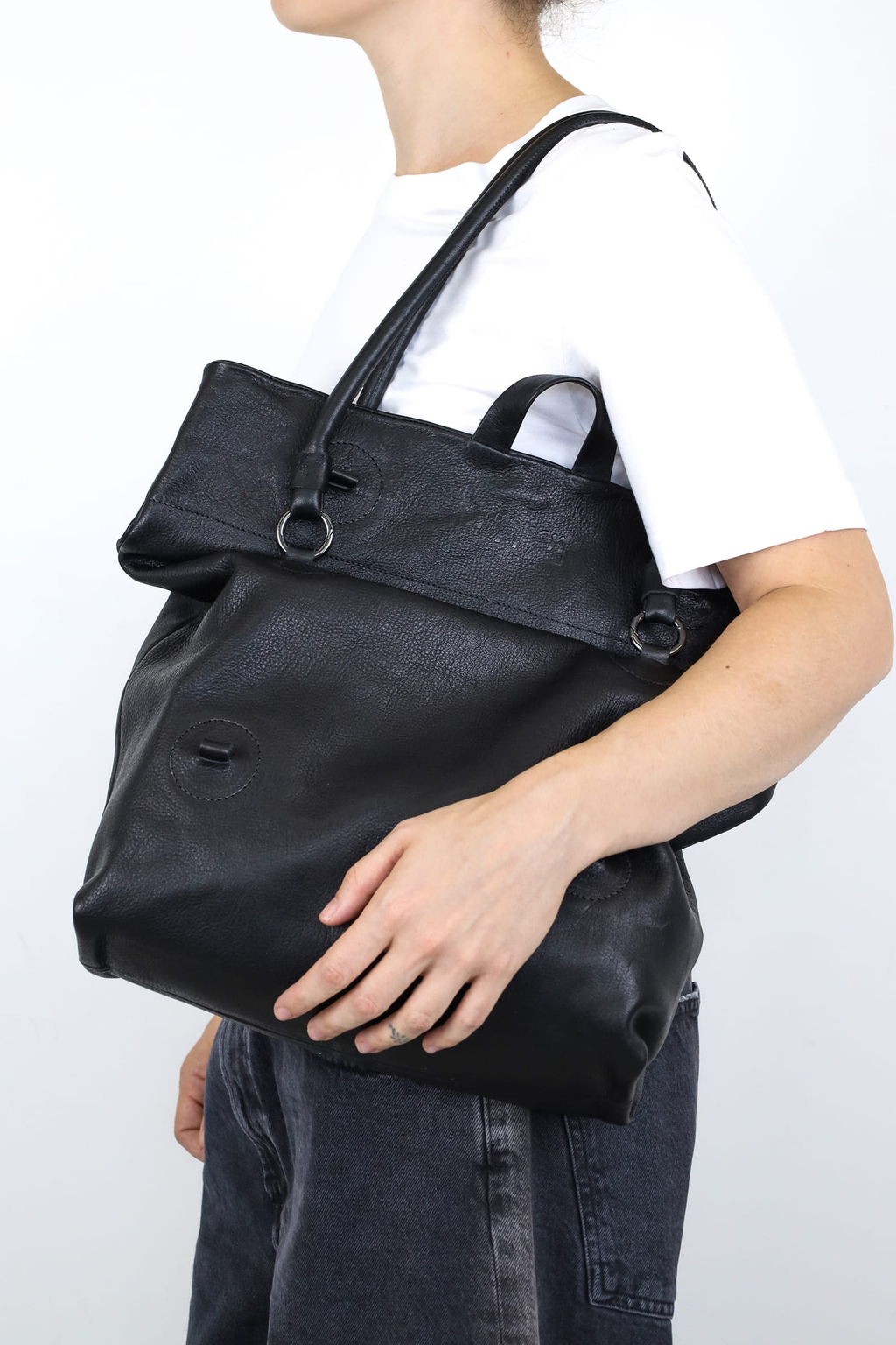 Les poignées amovibles, fixées avec des anneaux mousquetons, rendent ce sac spacieux transformable et polyvalent. Trois positions de poignée offrent trois sacs en un: un sac baguette déstructuré et sophistiqué, un sac à bandoulière de taille moyenne et un cabas adapté pour ordinateur portable.