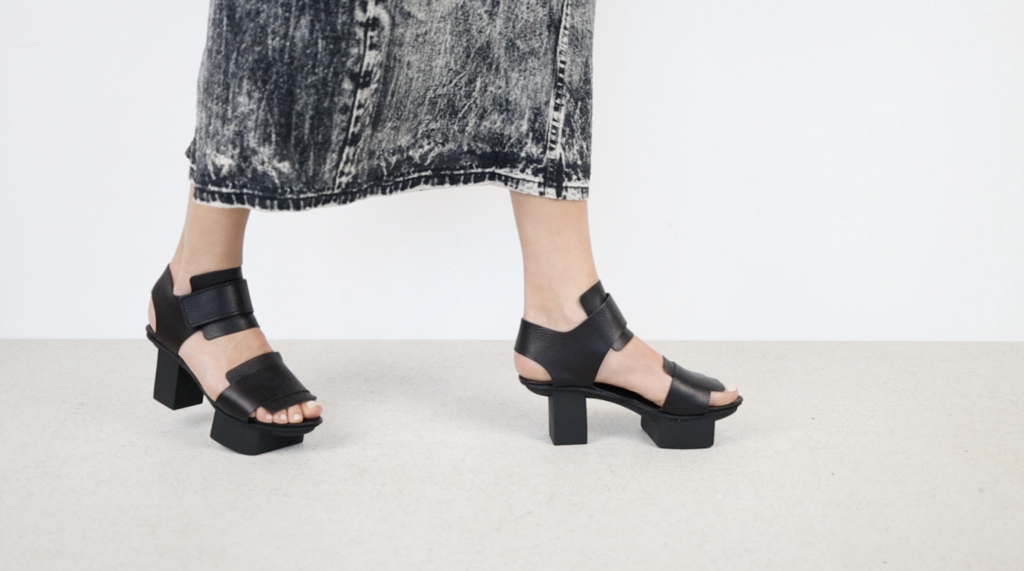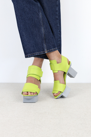 Sandale simple et fonctionnelle avec des éléments graphiques rectangulaires qui se chevauchent à l'avant et à la cheville et un large velcro à l'extérieur pour la fermeture