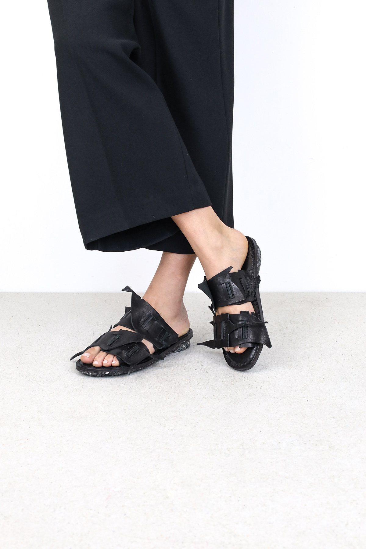 Dans la production de chaussures, même avec une approche zéro déchet rigoureuse, de petites chutes de cuir sont inévitablement générées. Pour cette sandale, nous avons développé une technique qui permet de réutiliser même les plus petits restes.