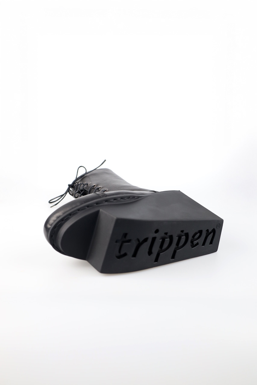 rehaussée par la semelle plateforme Geisha emblématique de Trippen, haute de 10 cm, qui affiche avec audace sa force, sa substance et son design.